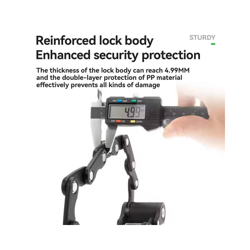Zapięcie łańcuchowe Rockbros to niezawodny sposób na zabezpieczenie Twojego roweru przed kradzieżą. Wykonane z hartowanej stali, stopu cynku i tworzywa ABS zapewnia bardzo wysoką odporność na piłowanie, wyłamanie i wiercenie.