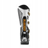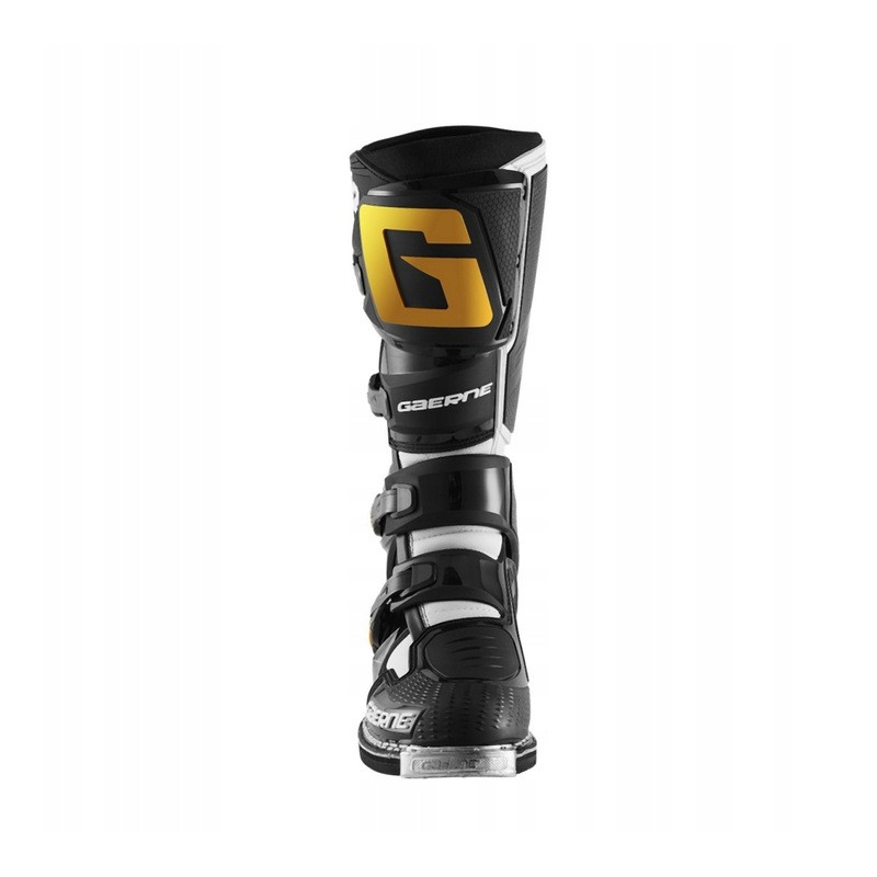 System Obrotu Dwustopniowego (Dual Stage Pivot System): Ten rewolucyjny system jest opatentowany i wyłączny dla firmy Gaerne. Obejmuje system dwóch punktów obrotu, z których pierwszy łączy się z cholewką (Razorback), zapewniając solidne wsparcie boczne. Płytka ślizgowa (glide-plate) utrzymuje górną część w stabilnej i pionowej pozycji. Drugi punkt obrotu jest zamocowany na przesuwnym prowadniku (sliding glide), co zapewnia naturalne czucie na podnóżku podczas zmiany biegów lub hamowania. Chociaż osiągnie dolny punkt oporu, amortyzuje wstrząsy podczas zbyt dalekich skoków (over-jumps) lub niepożądanych kompresji.