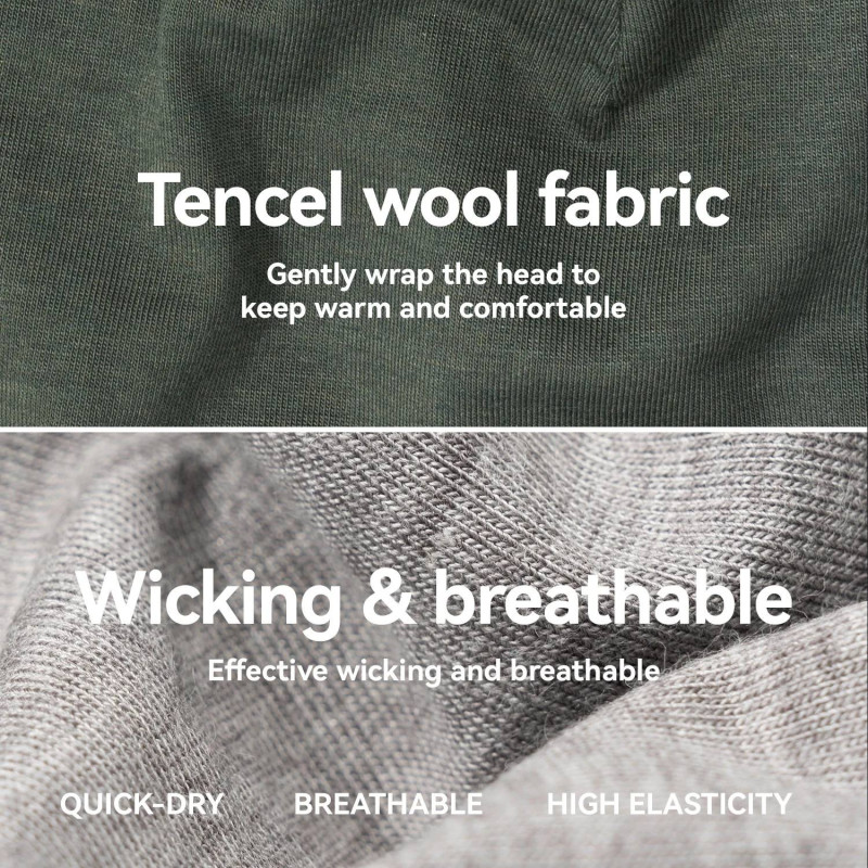Naturalna izolacja cieplna - wykorzystanie mieszanki wełny i włókien Tencel pozwala na skuteczne zatrzymywanie ciepła przy skórze. Wełna jest ceniona za swoje naturalne właściwości termoizolacyjne, natomiast Tencel wspomaga cyrkulację powietrza, co zapobiega przegrzewaniu się głowy.