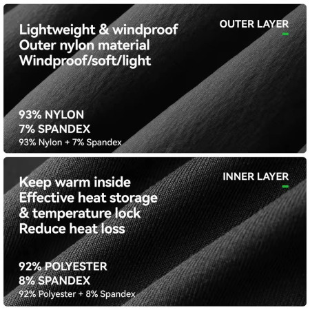 Dwuwarstwowa ochrona termiczna – warstwa zewnętrzna (93% nylon, 7% elastan) charakteryzuje się wysoką wiatroodpornością oraz lekkością. Warstwa wewnętrzna (92% poliester, 8% elastan) odpowiada za efektywne magazynowanie ciepła i blokowanie temperatury wewnątrz, co minimalizuje straty energii cieplnej organizmu.