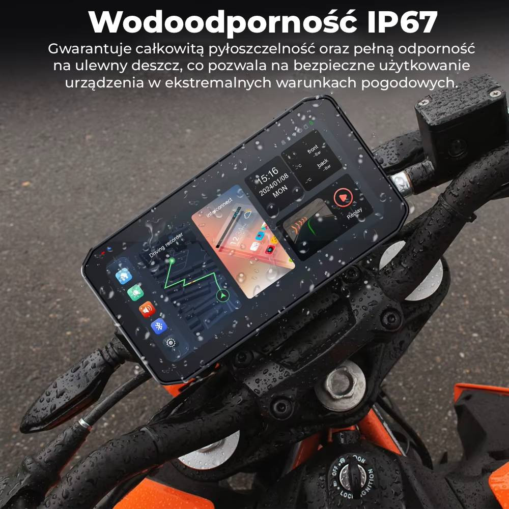 Klasa IP67: gwarantuje całkowitą pyłoszczelność oraz pełną odporność na ulewny deszcz, co pozwala na bezpieczne użytkowanie urządzenia w ekstremalnych warunkach pogodowych. Dzięki tej normie elektronika jest chroniona przed korozją i zalaniem, co znacząco wydłuża żywotność sprzętu montowanego na motocyklu.