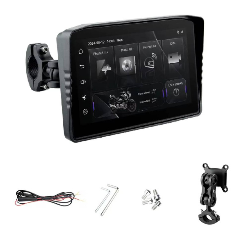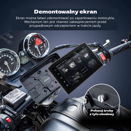 Praktyczny montaż: w zestawie znajduje się solidny uchwyt ze stopu cynku, który składa się z trzech komponentów i obsługuje 180° rotacji. Pozwala to na idealne dopasowanie kąta nachylenia ekranu do potrzeb motocyklisty i specyfiki pojazdu.