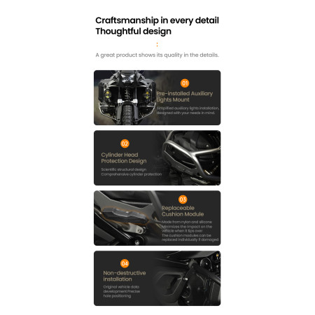 Crashbary zaprojektowane według OEM spec – pasują precyzyjnie i montują się bez ingerencji w ramę, bez przeróbek i bez stresu.