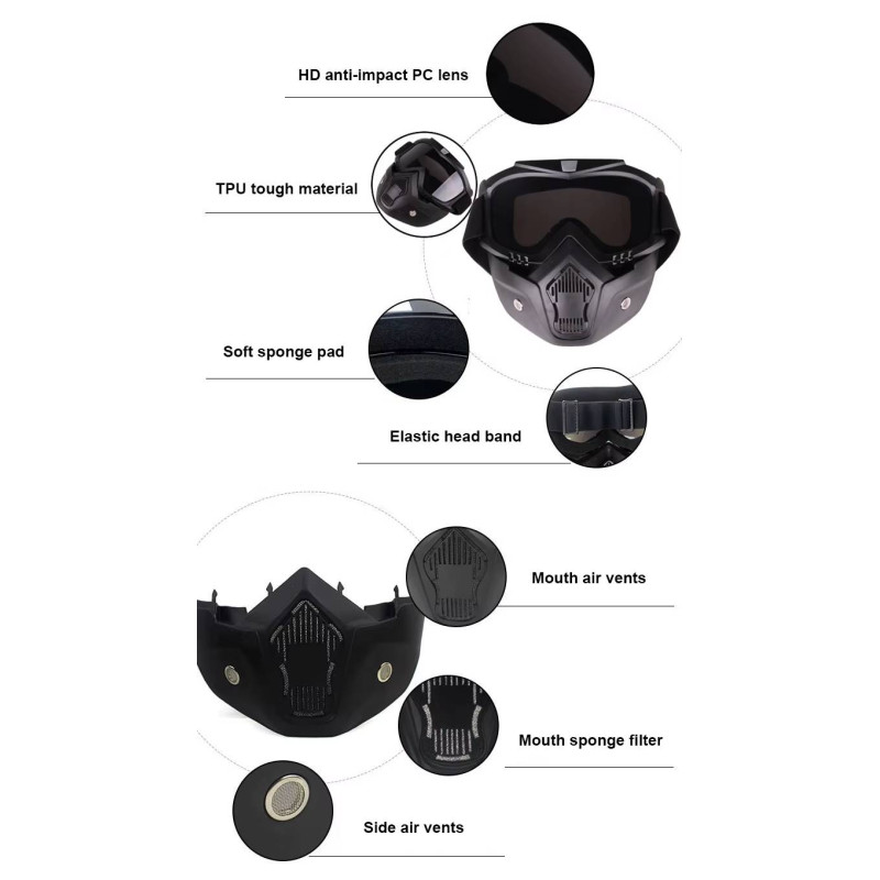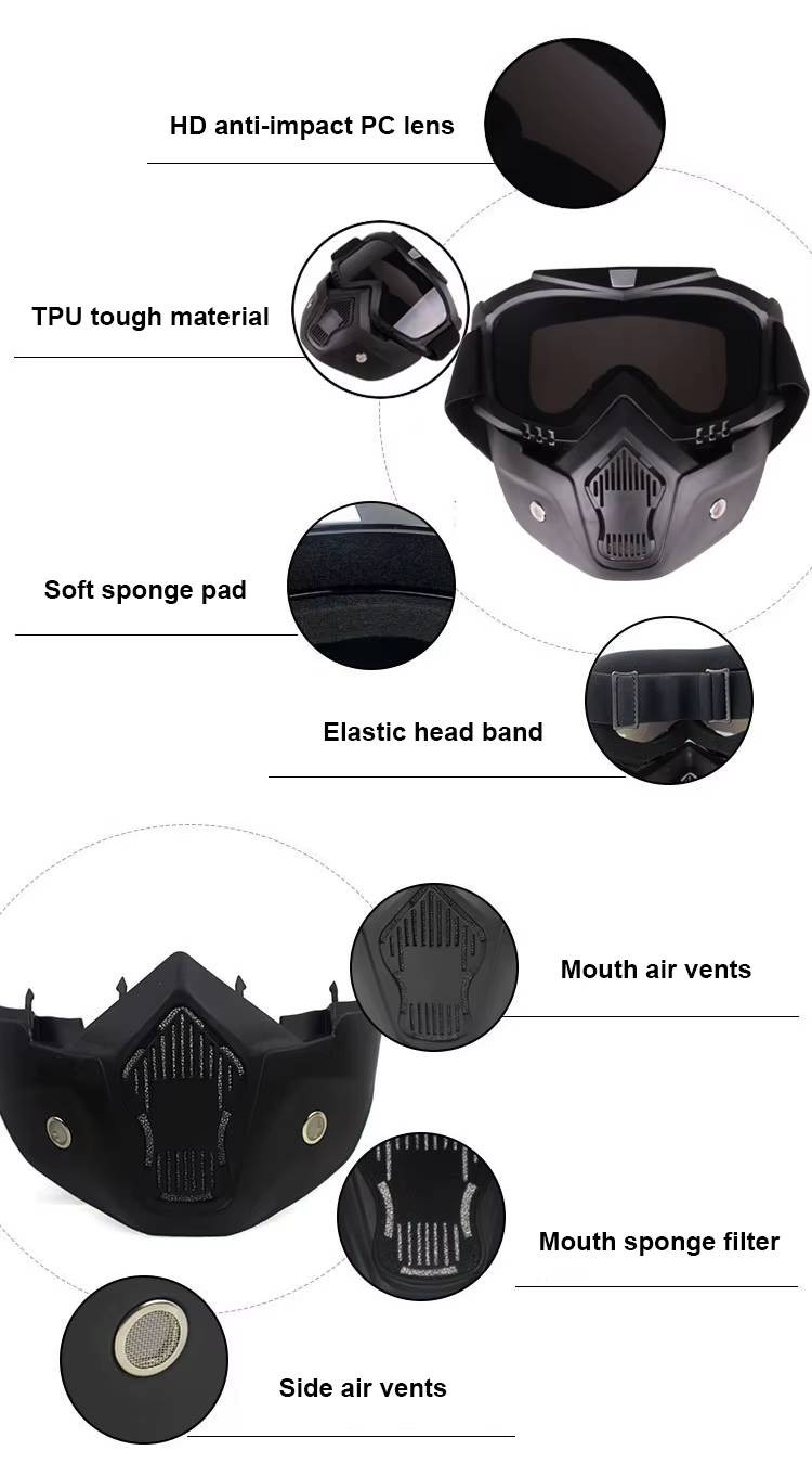 Te uniwersalne gogle z maską to zaawansowany zestaw ochronny 2w1, idealny dla entuzjastów sportów ekstremalnych, takich jak motocross, enduro, jazda na quadach, gokartach czy paintball. Produkt łączy w sobie maksymalną ochronę oczu i twarzy z nowoczesną technologią i komfortem użytkowania.