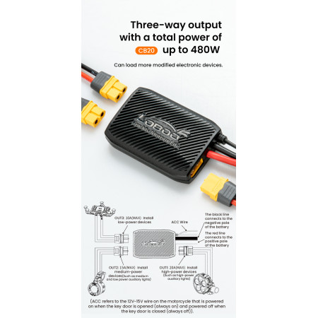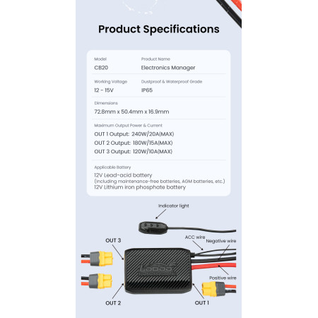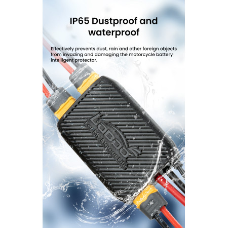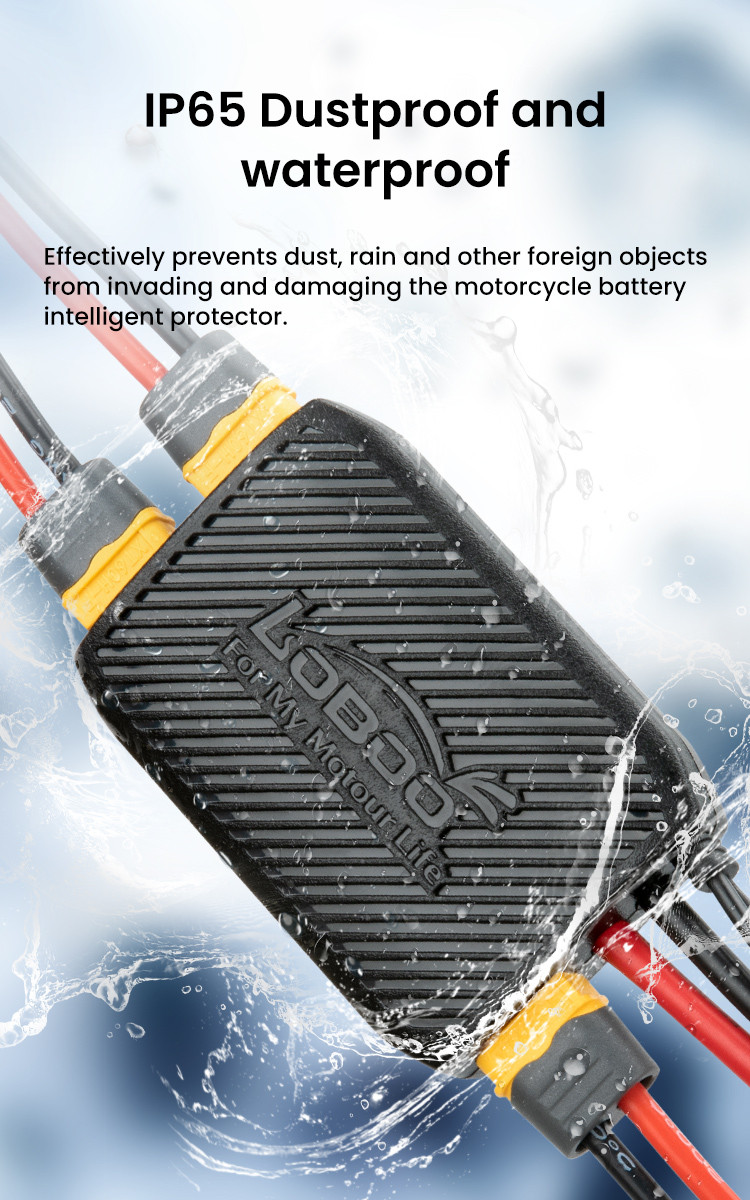 - IP65 Pyłoszczelny i wodoodporny, skutecznie zapobiega przedostawaniu się kurzu, deszczu i innych ciał obcych do inteligentnego zabezpieczenia akumulatora motocykla.