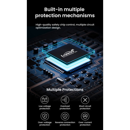 - Nadaje się do akumulatorów kwasowo-ołowiowych 12 V (w tym akumulatorów bezobsługowych, AGM itp.) i akumulatorów litowo-żelazowo-fosforanowych 12 V, pojemność ładowania 4-35A1