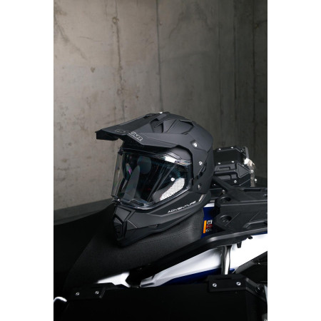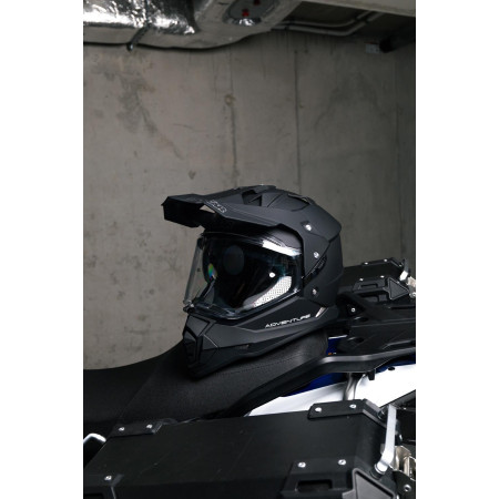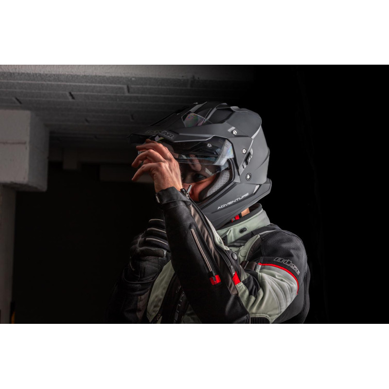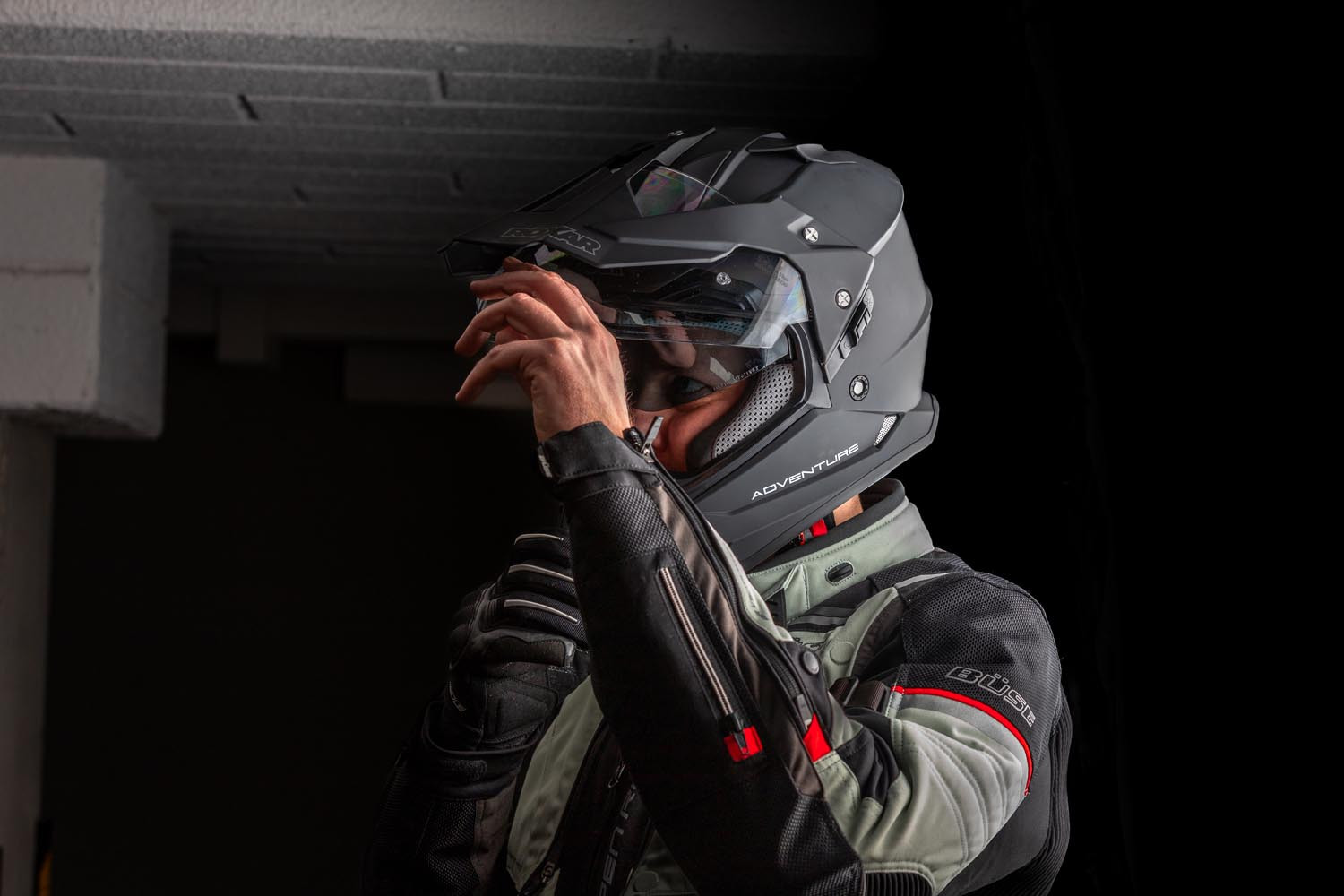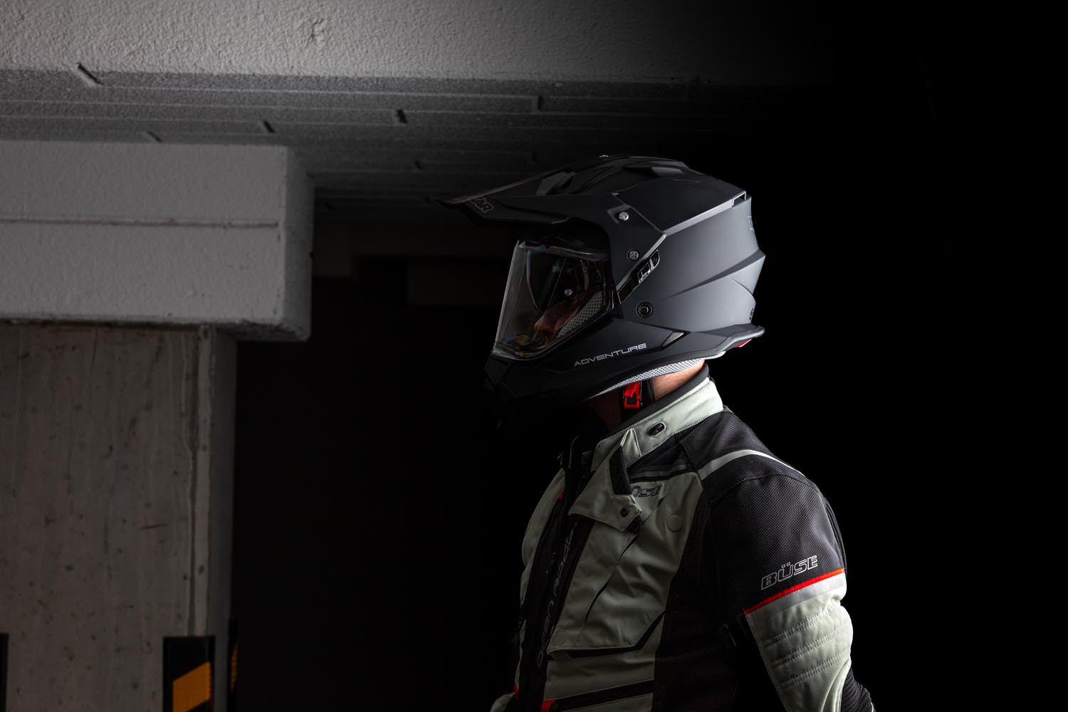 Funkcjonalny daszek Adventure: charakterystyczny, zintegrowany daszek pełni podwójną funkcję: chroni przed oślepiającym słońcem oraz stanowi barierę dla błota i deszczu. Jest to element nie tylko podnoszący walory użytkowe, ale także podkreślający agresywny, wyprawowy styl kasku.