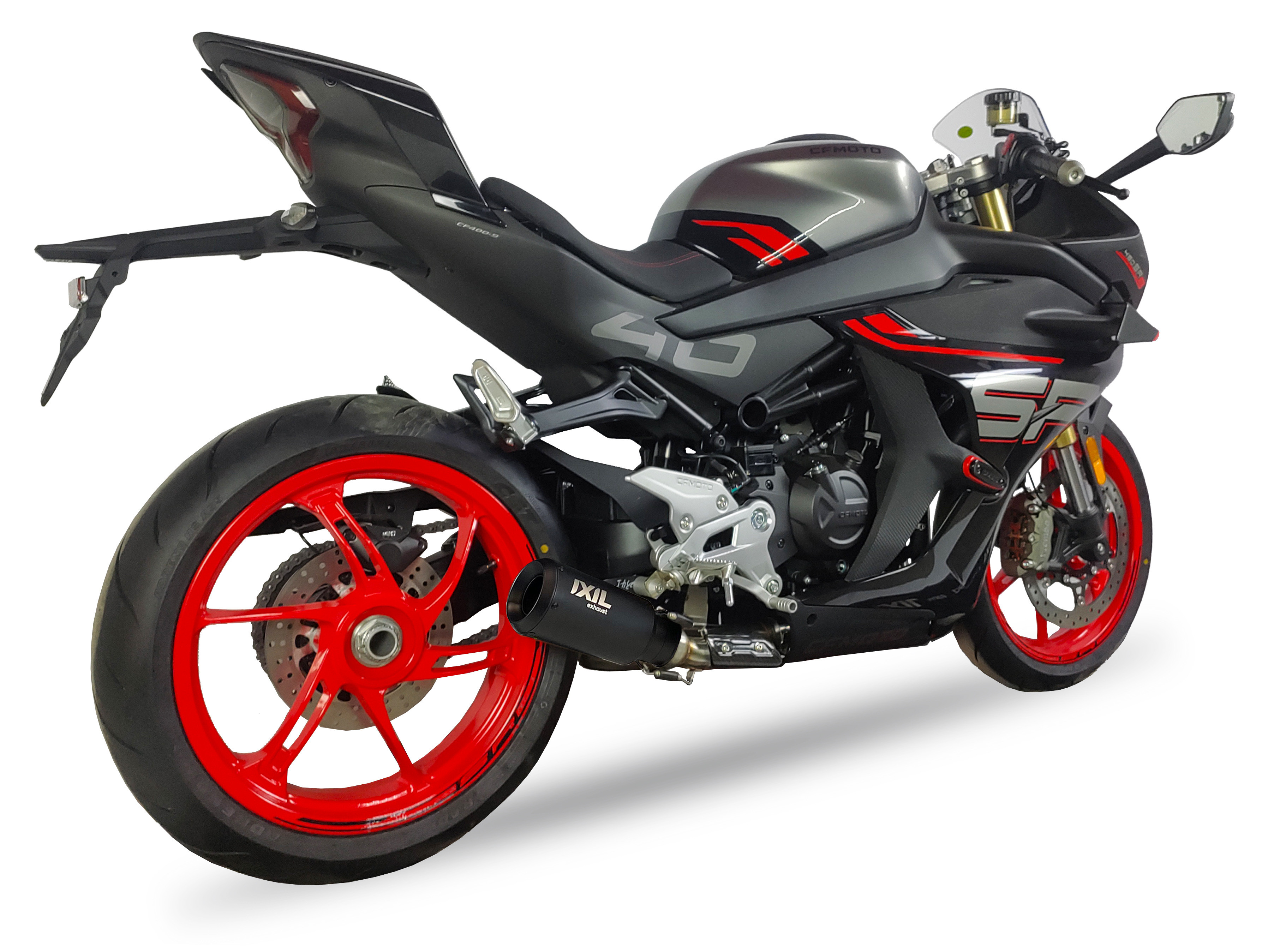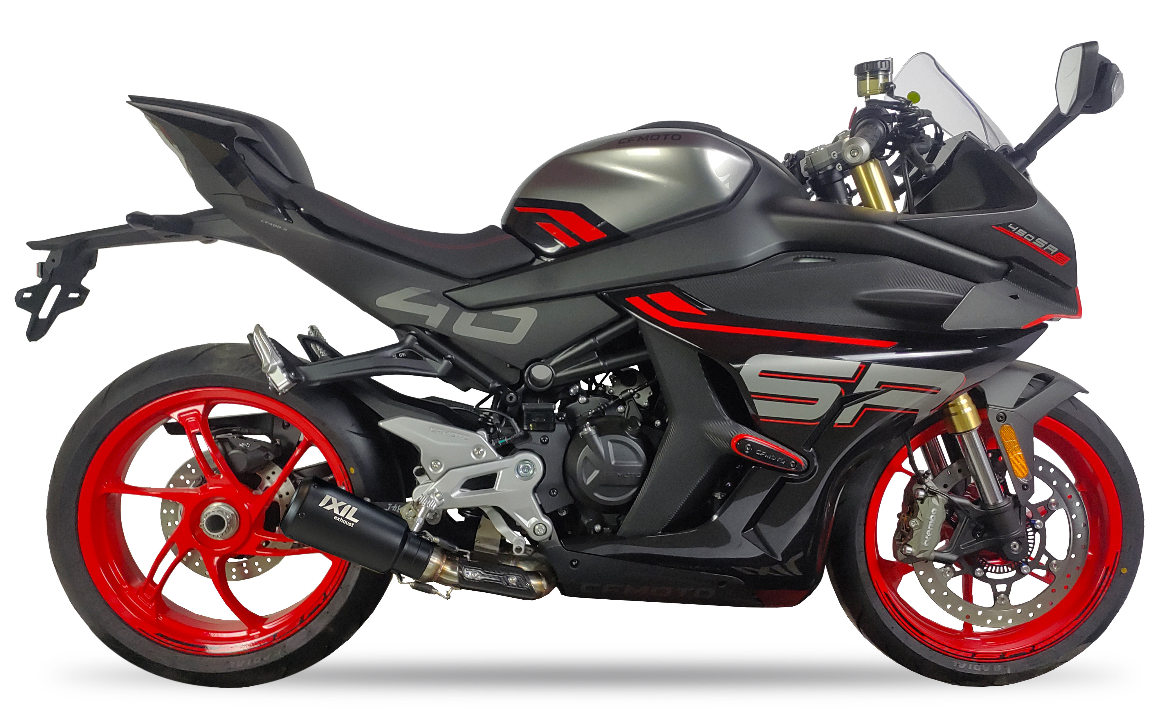 IXIL CF3234RB RB Slip-On Race Xtrem Black to sportowy tłumik wydechowy dedykowany do CFMOTO 450 SRS. Czarna, matowa powłoka i dynamiczne brzmienie podkreślają sportowy charakter motocykla, oferując agresywny wygląd i głębszy dźwięk — idealny wybór dla miłośników dynamicznej jazdy.