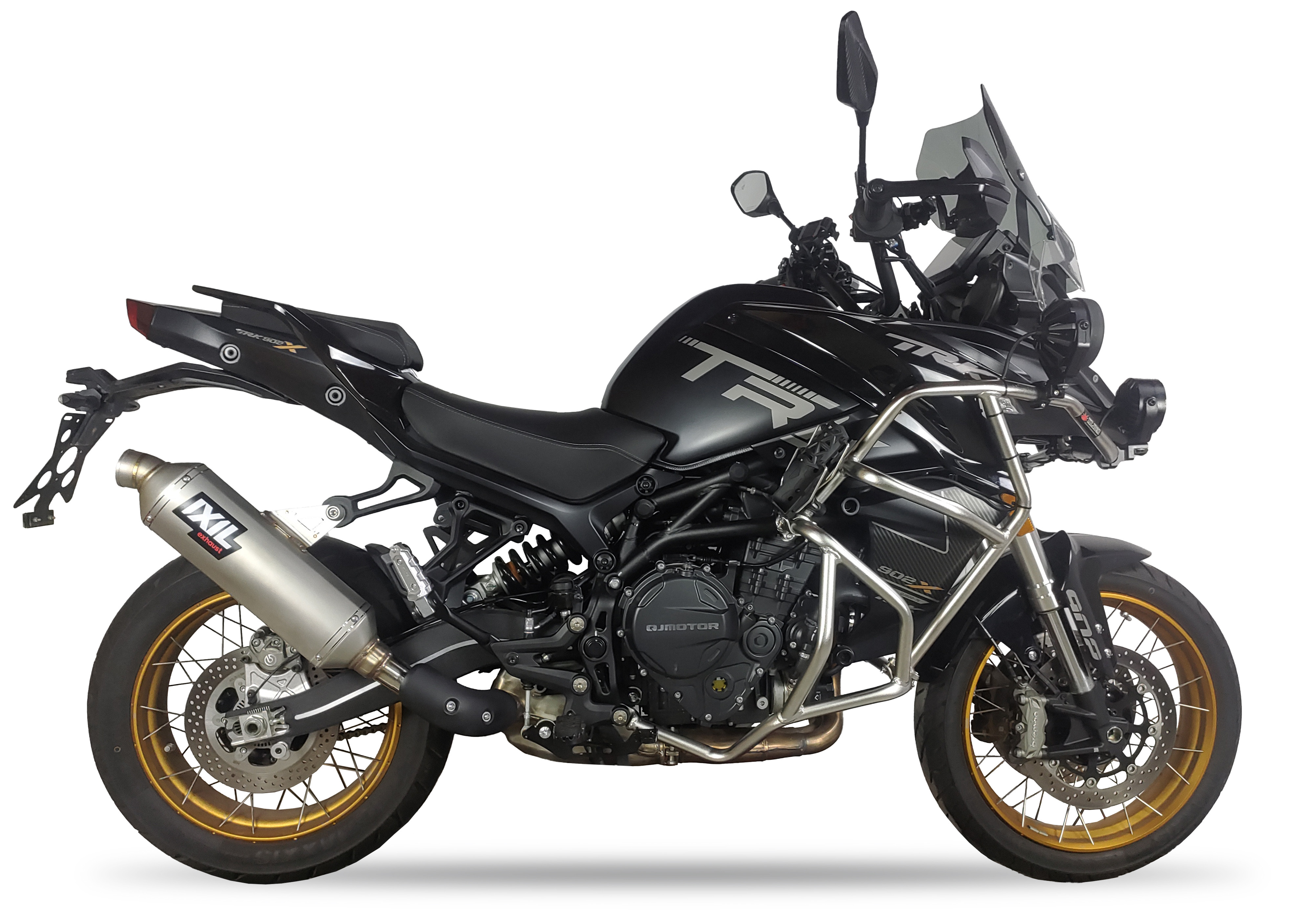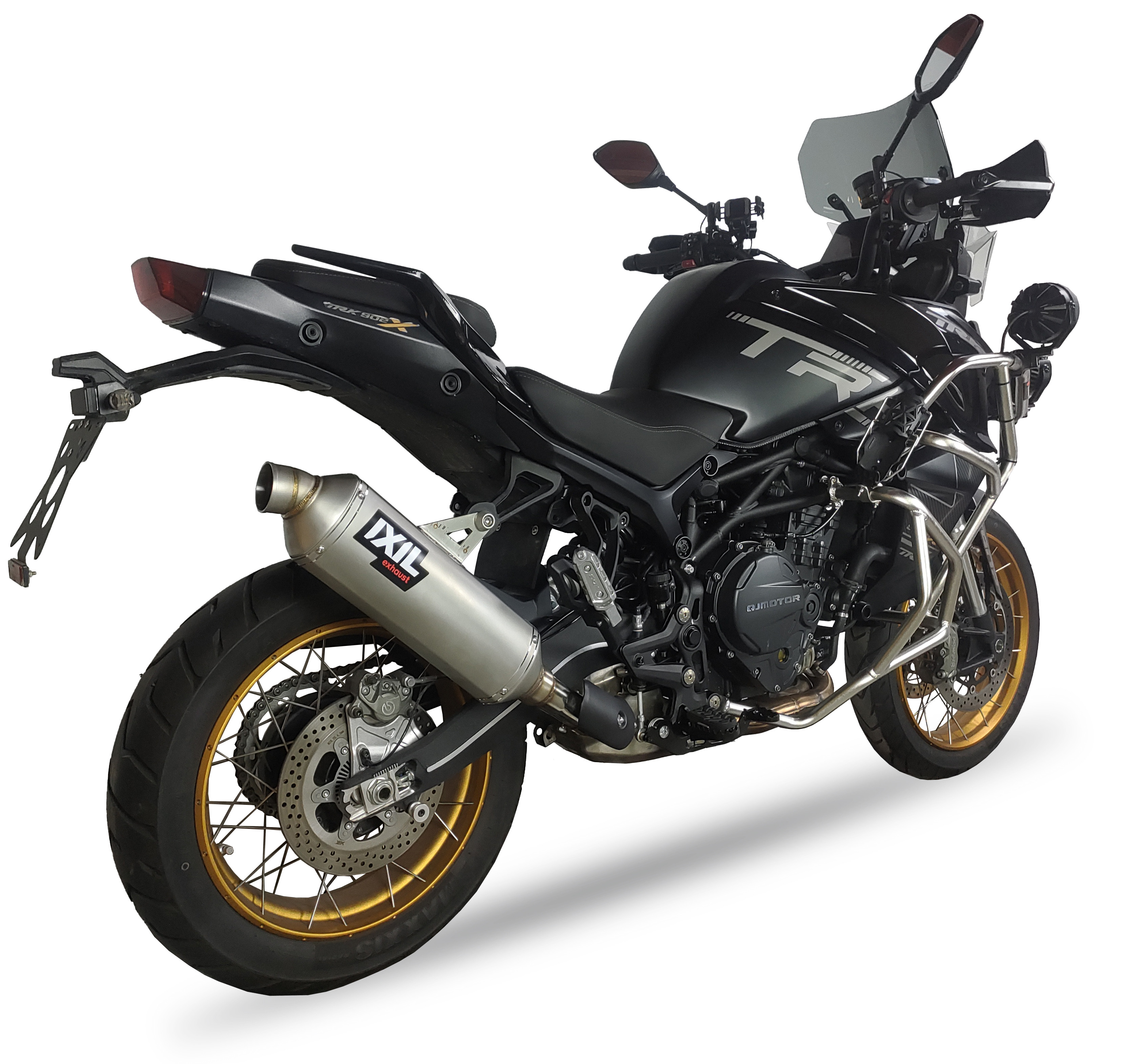 Model należy do serii RALLY SERIES i ma przekrój Hexoval 130x100 mm. Oficjalna karta techniczna IXIL podaje długość 493 mm oraz wagę 3.120 g, a logo oznaczono jako IXIL LOGO. Dzięki temu można go opisać jako slip-on o zwartej, bardziej adventure’owej sylwetce, dobrze pasującej do charakteru QJ MOTOR SRT 900 S / SX.