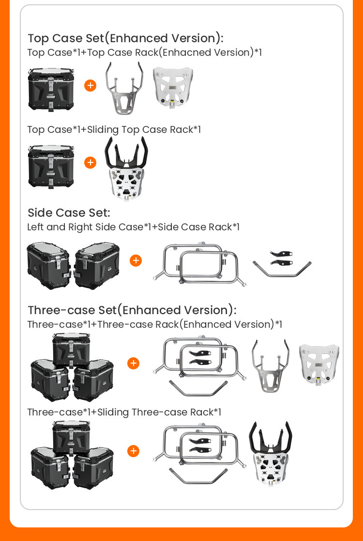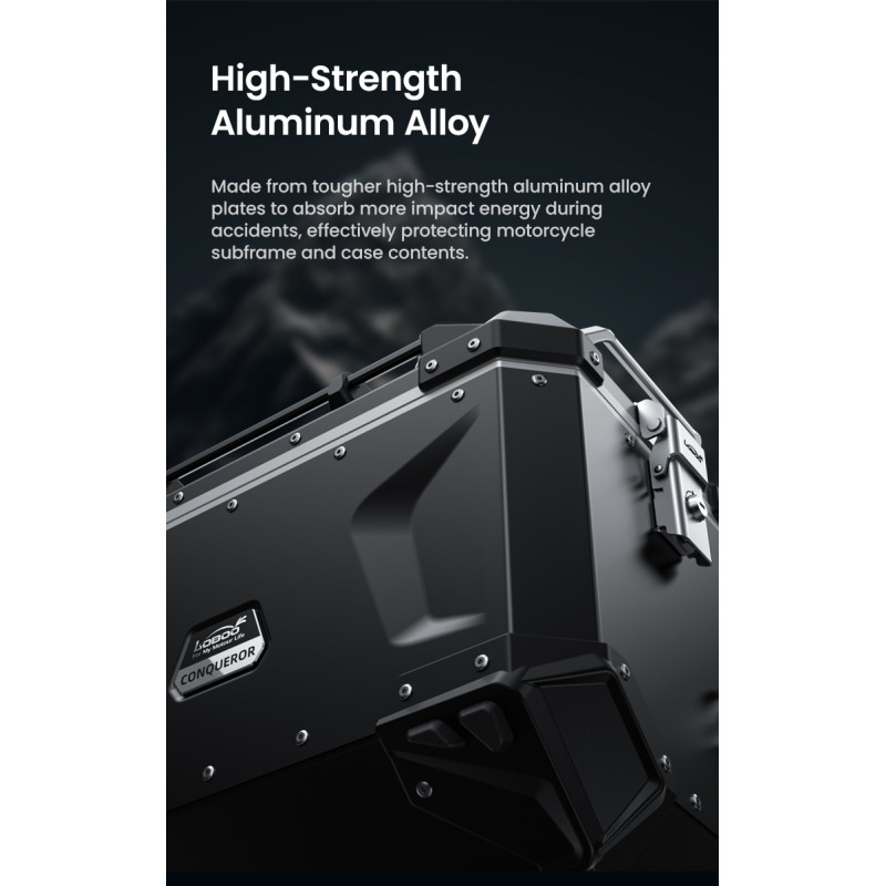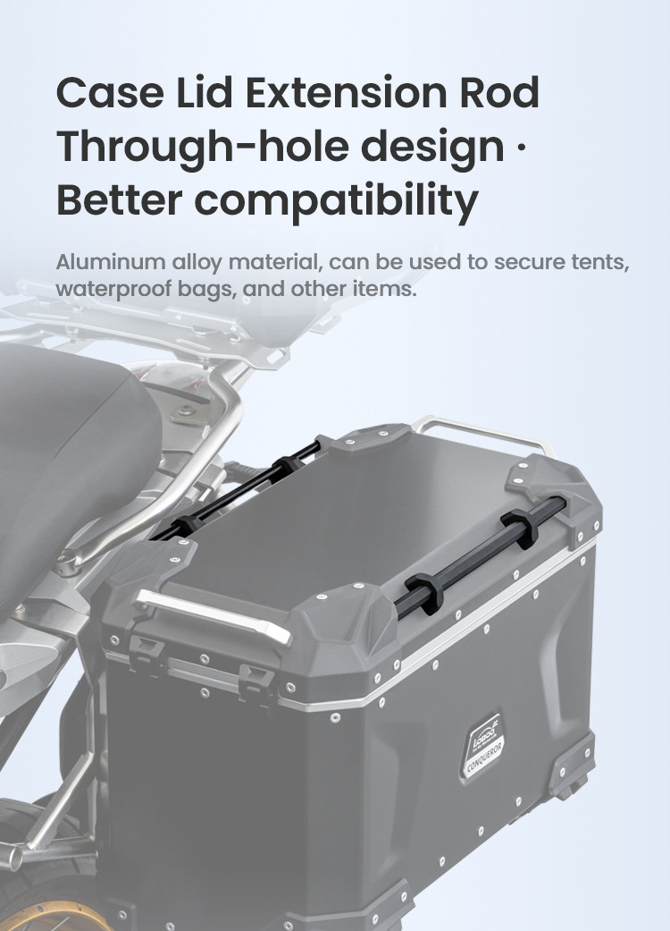 Gumowe, odporne na ścieranie odbojniki, dodane do zewnętrznych narożników kufrów, skutecznie absorbują siłę uderzenia i chronią stelaż motocykla oraz zawartość kufra. Kufer posiada również dodatkowe aluminiowe drążki ułatwiające montaż na nim dodatkowego bagażu.