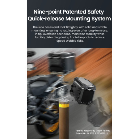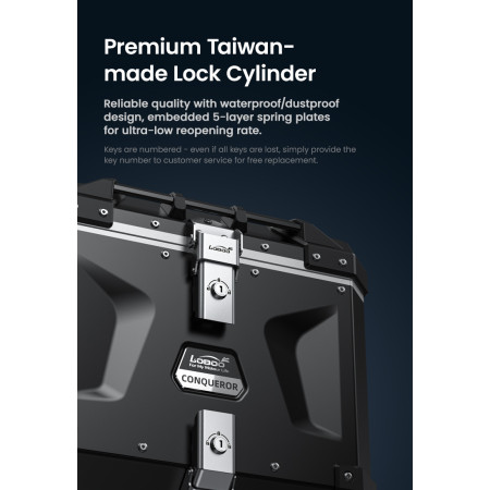 System szybkiego montażu i demontażu zapewnia wyjątkową wygodę użytkowania. Do jego instalacji niezbędny jest kompatybilny, dedykowany stelaż górny LOBOO – upewnij się, że posiadasz odpowiedni bagażnik do swojego motocykla.