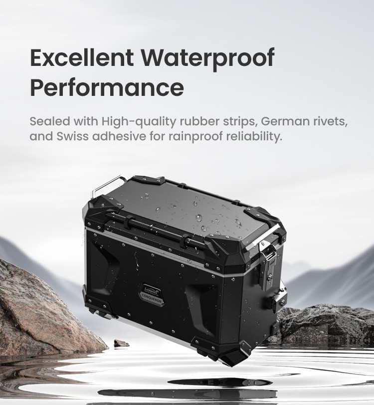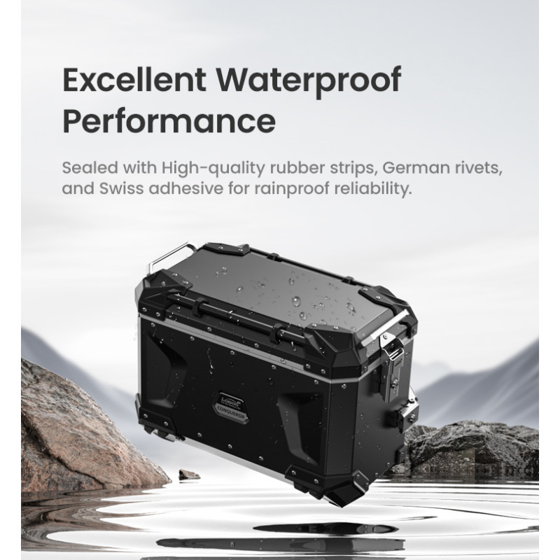Wszystkie elementy kufra montowane są za pomocą najwyższej jakości specjalnych nitów GEISPA, dzięki czemu nie tylko zachowują pełną wodoodporność ale również możliwa jest ich wymiana/naprawa w przypadku uszkodzenia.