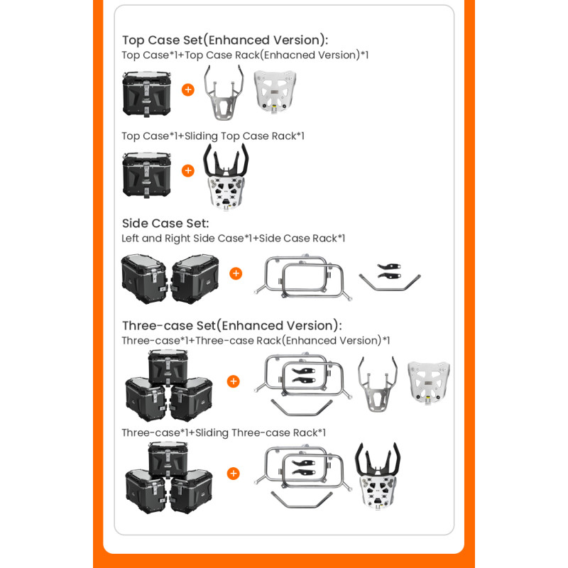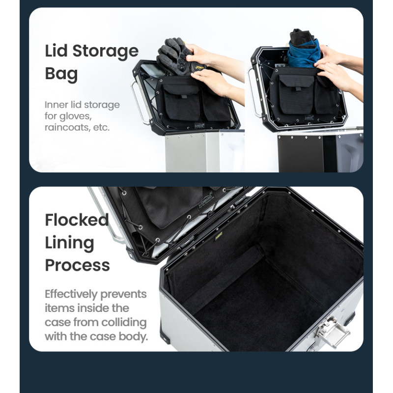 Wytrzymałe kufry boczne o pojemności 45+45 litrów, idealny na każdą podróż. Wykonane z wysokiej jakości stopu aluminium, gwarantuje niezawodność i odporność na uszkodzenia mechaniczne, jednocześnie zachowując stylowy, aluminiowy lub czarny matowy design.