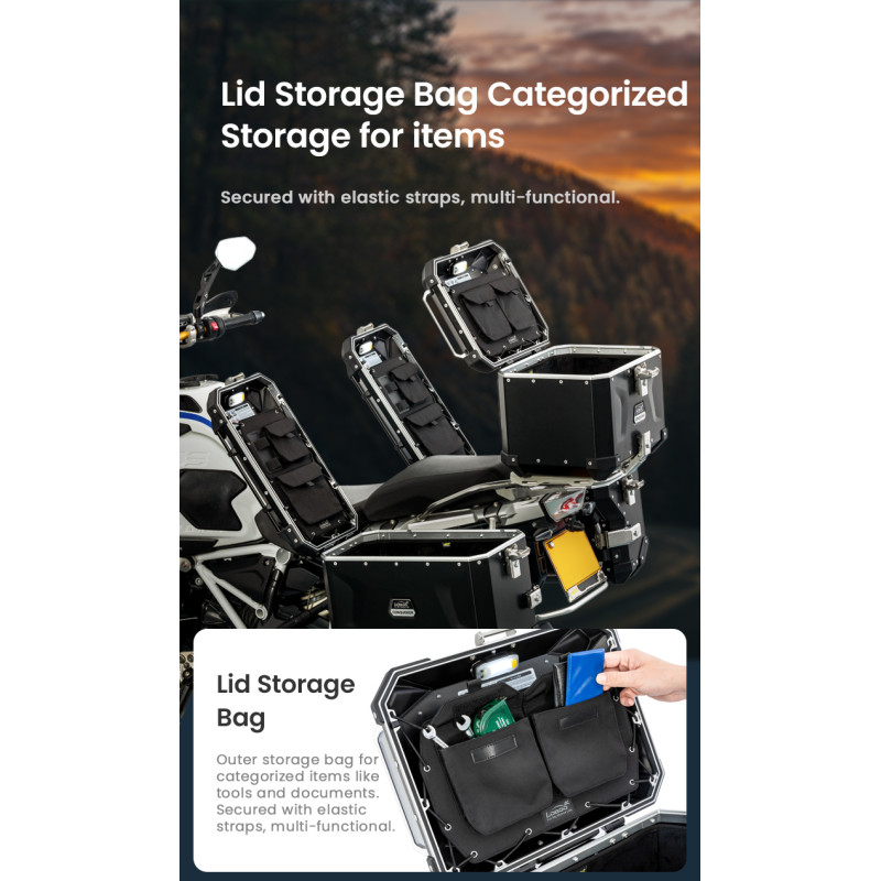 System szybkiego montażu i demontażu zapewnia wyjątkową wygodę użytkowania. Do jego instalacji niezbędny jest kompatybilny, dedykowany stelaż boczny LOBOO – upewnij się, że posiadasz odpowiedni bagażnik do swojego motocykla.