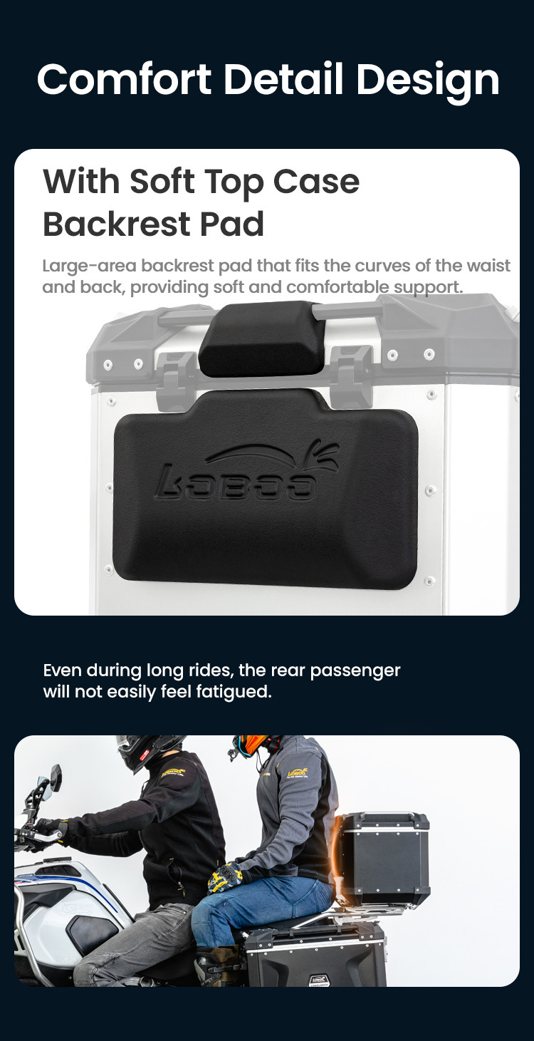 Gumowe, odporne na ścieranie odbojniki, dodane do zewnętrznych narożników kufrów, skutecznie absorbują siłę uderzenia i chronią stelaż motocykla oraz zawartość kufra. Kufer posiada również dodatkowe aluminiowe drążki ułatwiające montaż na nim dodatkowego bagażu. Duże ścięcie (fazowanie) poprawia limity pochylenia w zakrętach.
