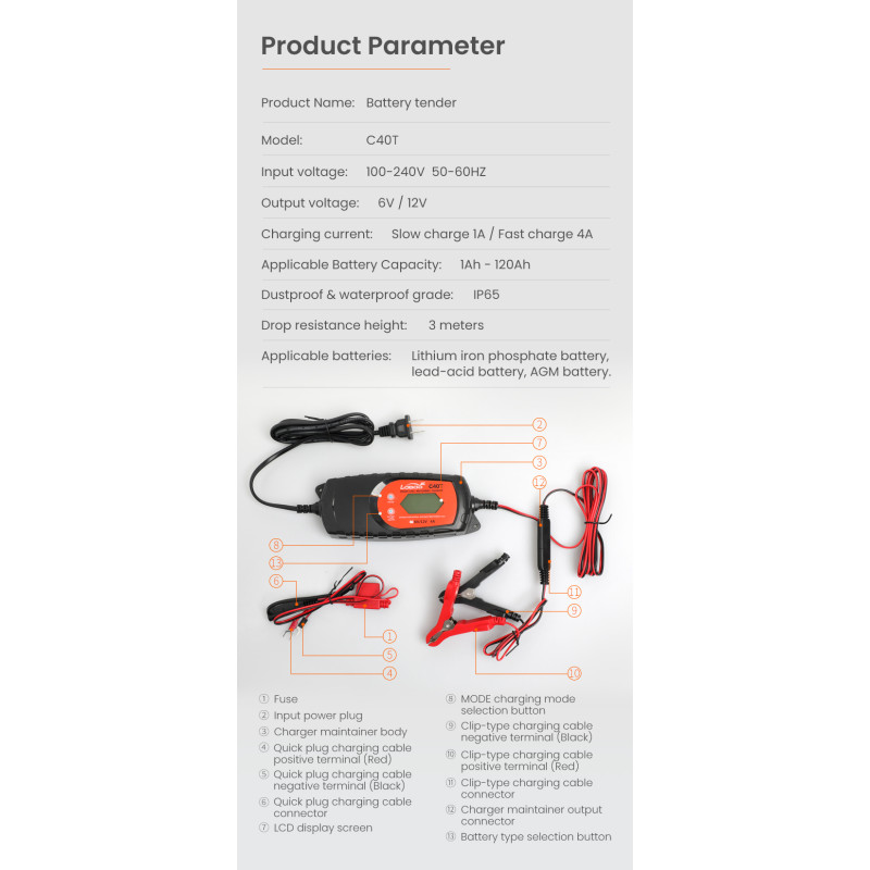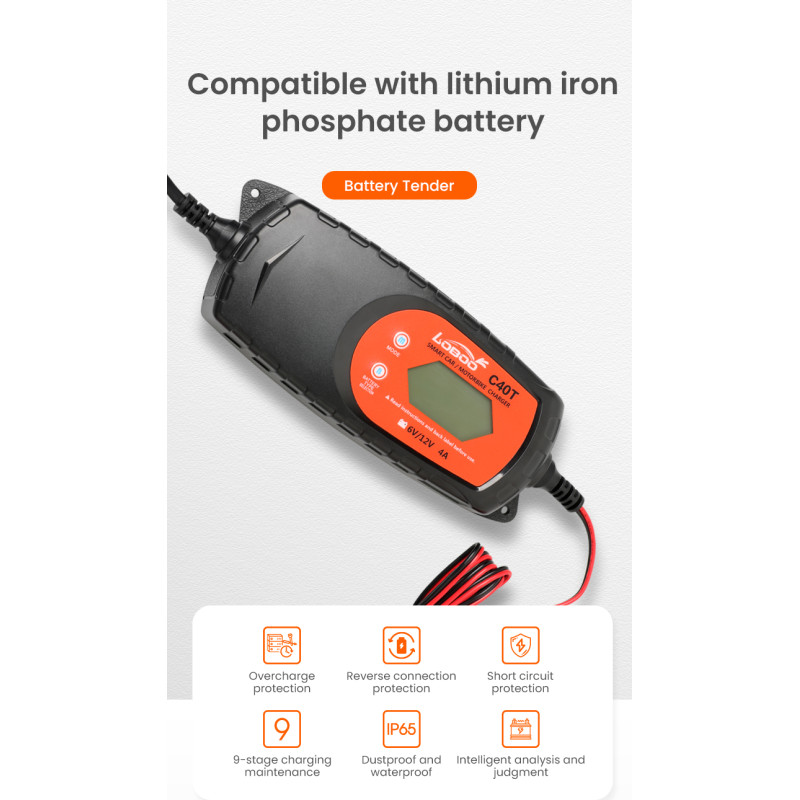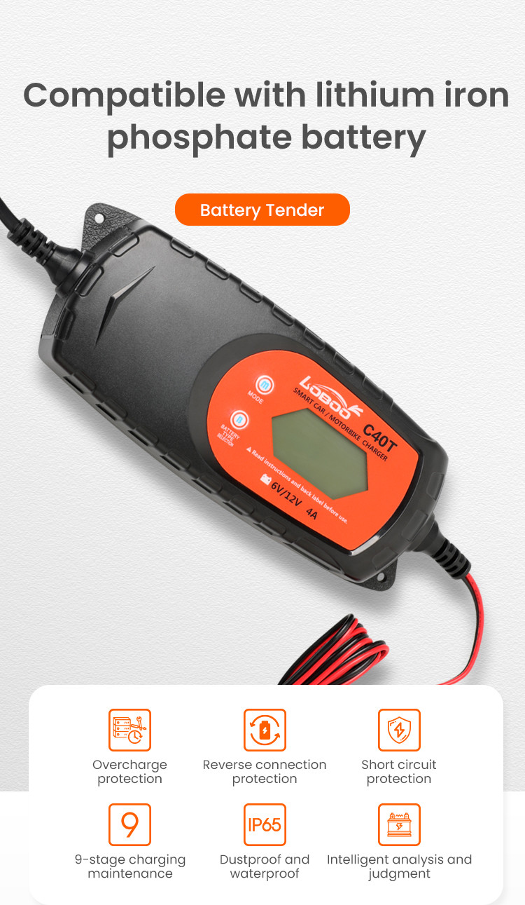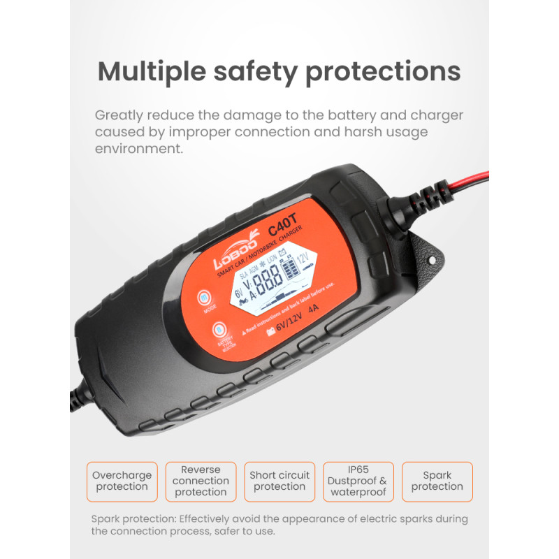 +48500464804Motocykl stoi zimą? Albo jeździsz rzadziej i akumulator lubi kaprysić w najmniej odpowiednim momencie? LOBOO C40T to ładowarka-podtrzymywacz, który robi robotę za Ciebie: ładuje, regeneruje i utrzymuje baterię w formie, żebyś po przekręceniu kluczyka nie usłyszał tylko smutnego „klik”.