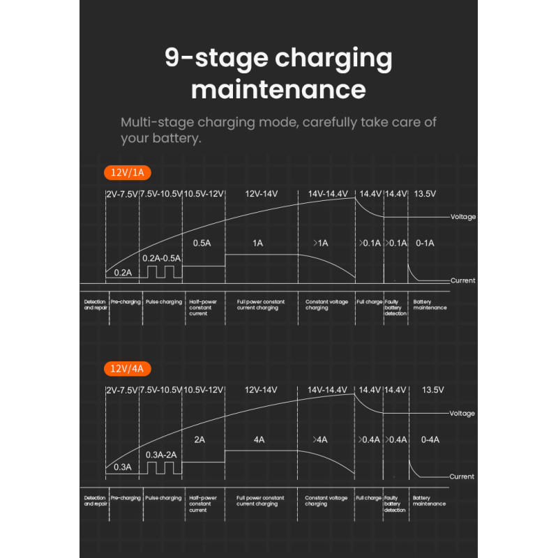 Ładuje wszystkie akumulatory ołowiowo-żelowe, kwasowo-ołowiowe oraz AGM o pojemności 1.2-63 Ah.