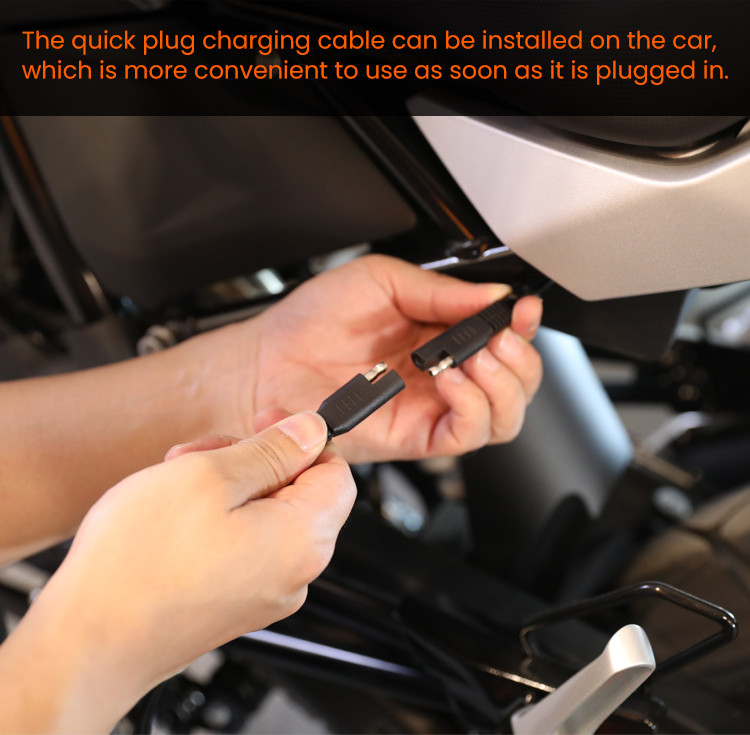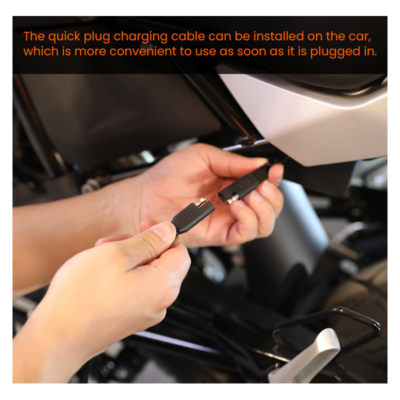 W zestawie: szybkozłącza/przewody do ładowania z krokodylkami i konektorami oczkowymi (ring terminals) – wygodnie pod stały montaż w moto.