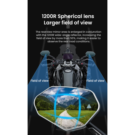- Szersze pole widzenia: Wyposażone w soczewkę sferyczną 1200R, która powiększa pole widzenia o ponad 50%, ułatwiając obserwację sytuacji drogowych za motocyklem.