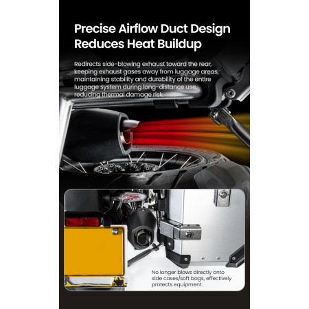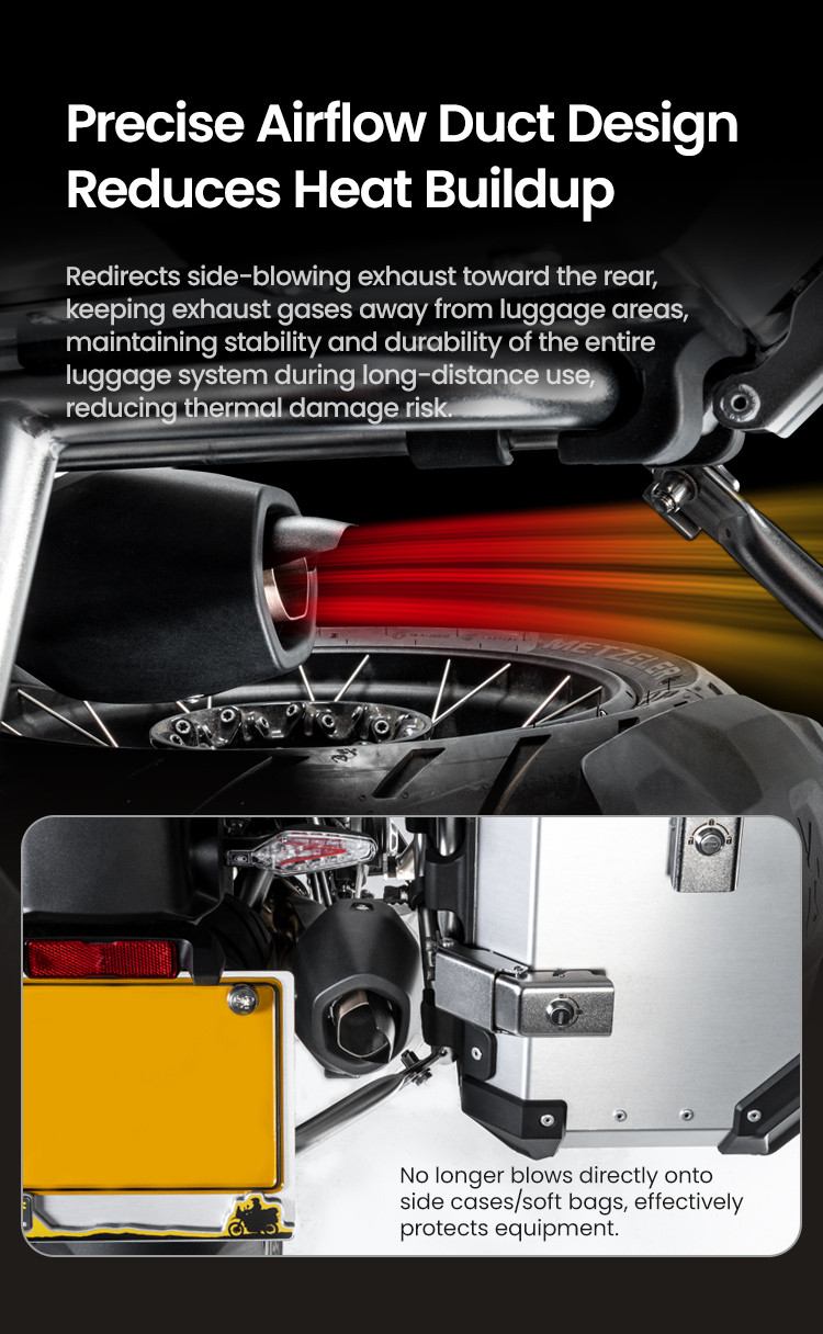 W praktyce oznacza to więcej spokoju w trasie. Jeśli jeździsz z miękkimi sakwami, dobrze wiesz, że wysoka temperatura z wydechu może z czasem osłabiać materiał, niszczyć paski albo po prostu niepotrzebnie przegrzewać bagaż. Deflektor LOBOO pomaga odsunąć strefę gorąca od miękkiego bagażu, a także ogranicza odkładanie się sadzy i przebarwień na aluminiowych kufrach oraz foliach ochronnych. To mały element, ale taki, który realnie robi różnicę podczas dalszych wyjazdów i codziennego użytkowania.