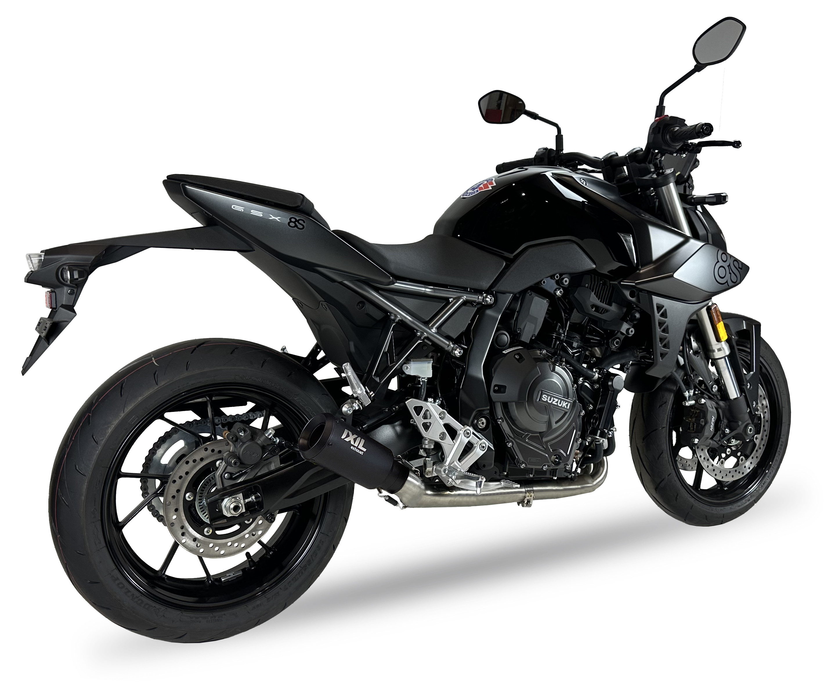 Sportowy IXIL RB Full System Race Xtrem Black to kompletny układ wydechowy dedykowany do Suzuki GSX-8TT 25-26 (WEM2/WEM3) — wykonany z odpornej stali nierdzewnej AISI304 z czarnym lakierowanym wykończeniem. Charakterystyczny, stożkowy tłumik o długości ~230 mm z laserowo grawerowanym logo, który podkreśla agresywny styl motocykla. System nie posiada homologacji CE (wersja Race).