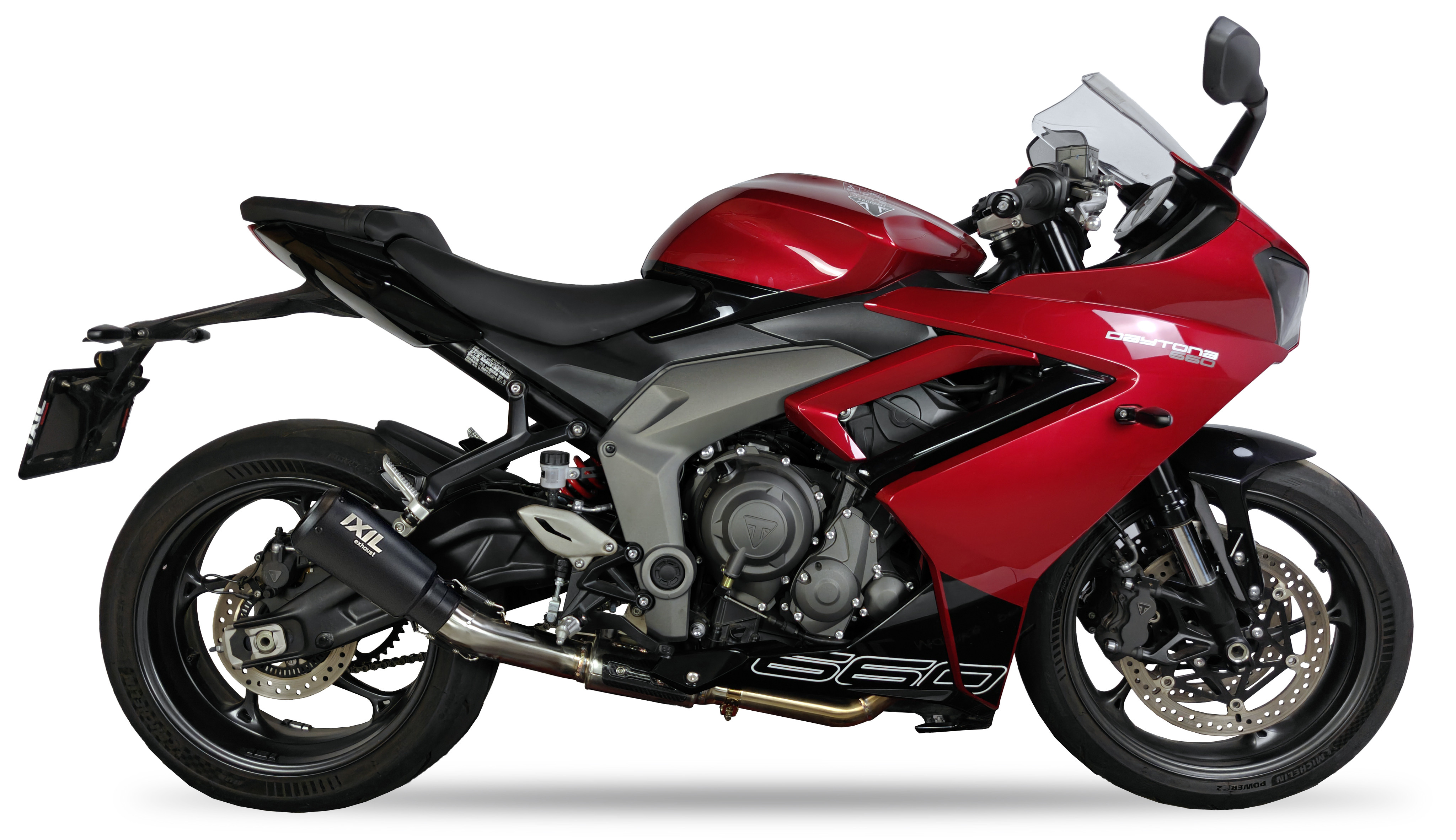 IXRACE AT4251SB MK2B Series Black Full System to homologowany sportowy układ wydechowy dedykowany do Triumph Daytona 660 2024 (LG20 / LG21). Kompletny system z czarnym, matowym wykończeniem podkreśla agresywny styl motocykla i generuje głębsze, sportowe brzmienie, zachowując homologację drogową.