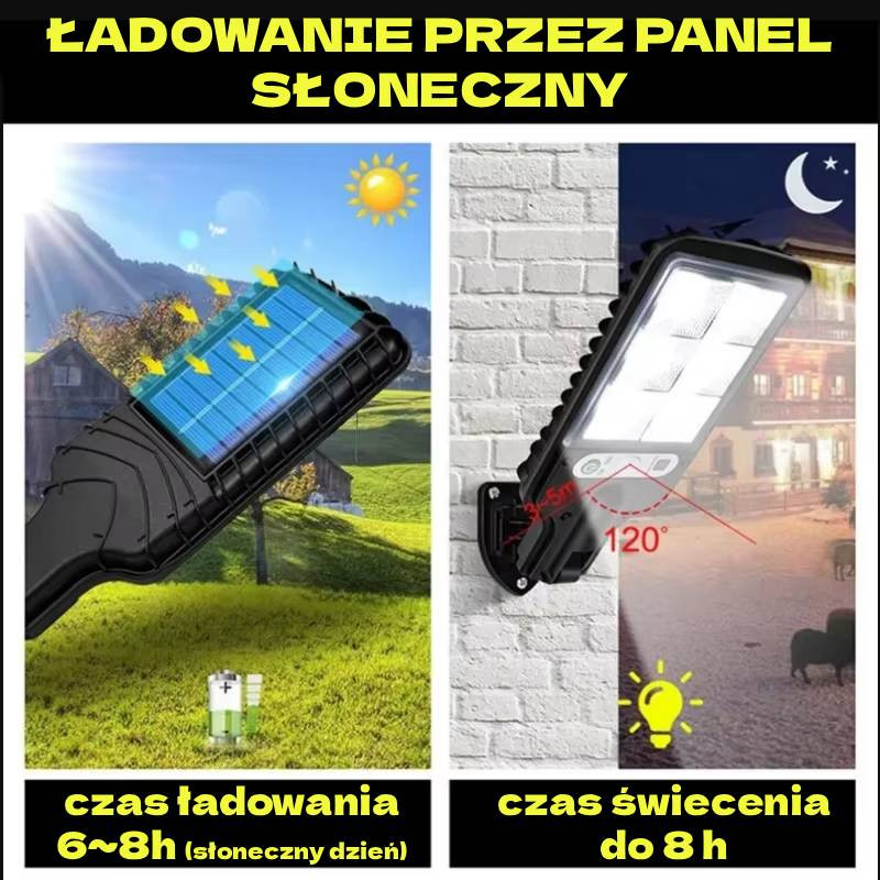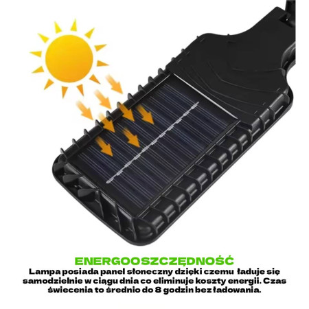 Energooszczędność: lampa posiada panel słoneczny dzięki czemu ładuje się samodzielnie w ciągu dnia co eliminuje koszty energii. Czas świecenia to średnio do 8 godzin bez ładowania.