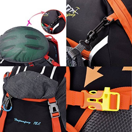W zestawie znajduje się praktyczne etui – mini torebka na telefon lub pieniądze, którą można przypiąć do plecaka dzięki szlufce na rzep. Regulowane szelki posiadają dwa ringi "d" do mocowania akcesoriów, a w klamrze regulowanego pasa piersiowego wbudowano gwizdek sygnalizacyjny dla zwiększenia bezpieczeństwa w sytuacjach awaryjnych.