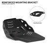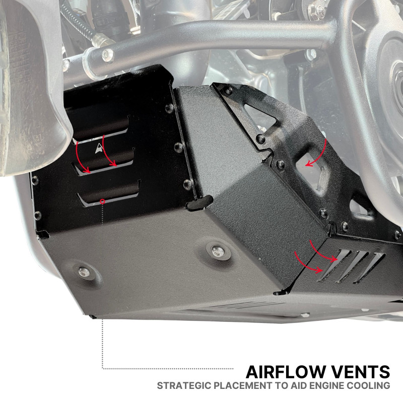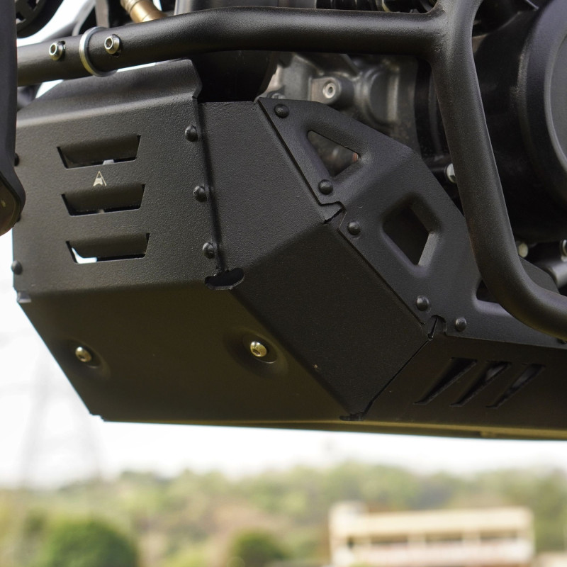 Profesjonalna osłona silnika wykonana z tłoczonego aluminium o grubości 2,5 mm zapewnia zaawansowaną ochronę przed kamieniami, kłodami oraz innymi zanieczyszczeniami spotykanymi na trasie. Konstrukcja ta stanowi istotne wzmocnienie względem fabrycznych osłon o grubości 1,5 mm montowanych na elementach gumowych. Zastosowanie wzmocnionego systemu montażowego z dedykowanym wspornikiem dla układu wydechowego gwarantuje, że płyta nie wygina się i zachowuje swoją integralność nawet przy nagłych uderzeniach.