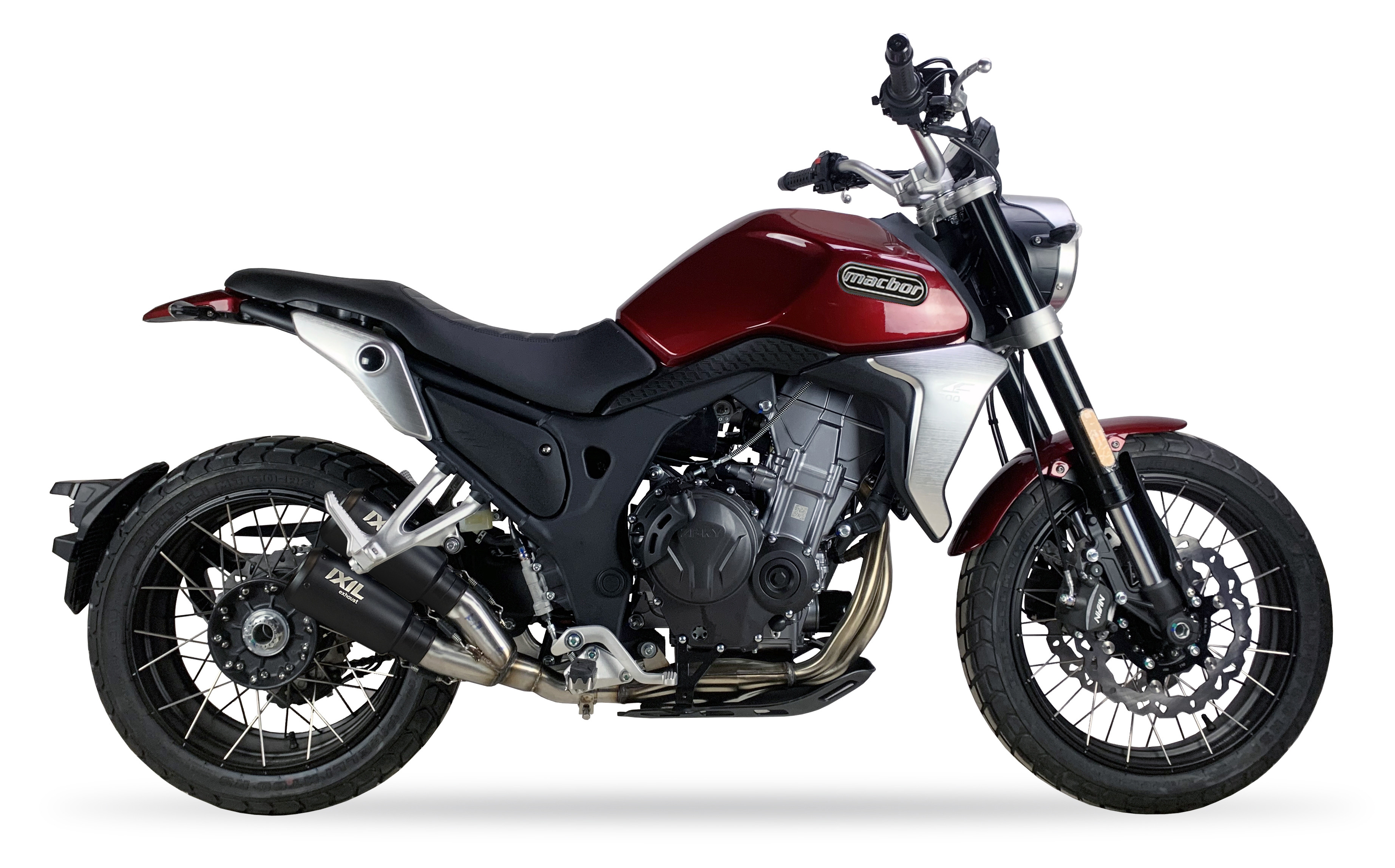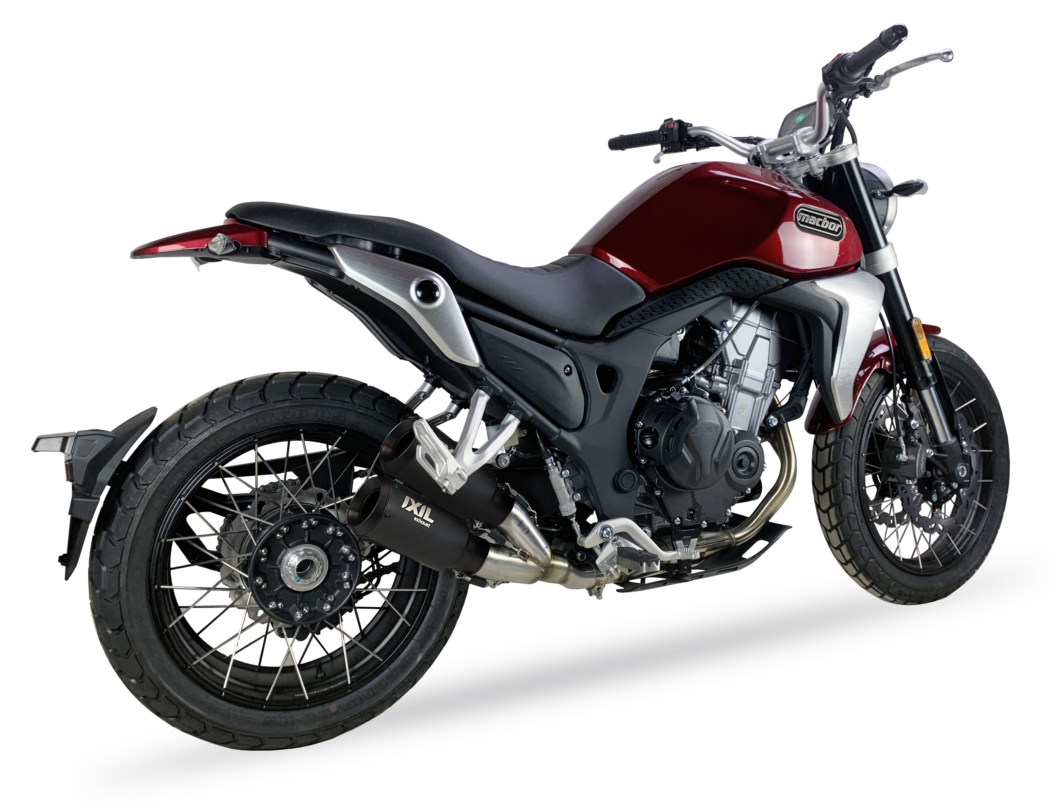 IXIL 2RB Dual Race Xtrem Black to podwójny sportowy układ wydechowy typu dual slip-on, zaprojektowany specjalnie dla motocykli Macbor Eight Mille 500 SCR oraz STR z rocznika 2022. Zestaw składa się z dwóch kompaktowych tłumików (górnego i dolnego), które zastępują seryjne końcówki wydechu, zachowując fabryczny kolektor.