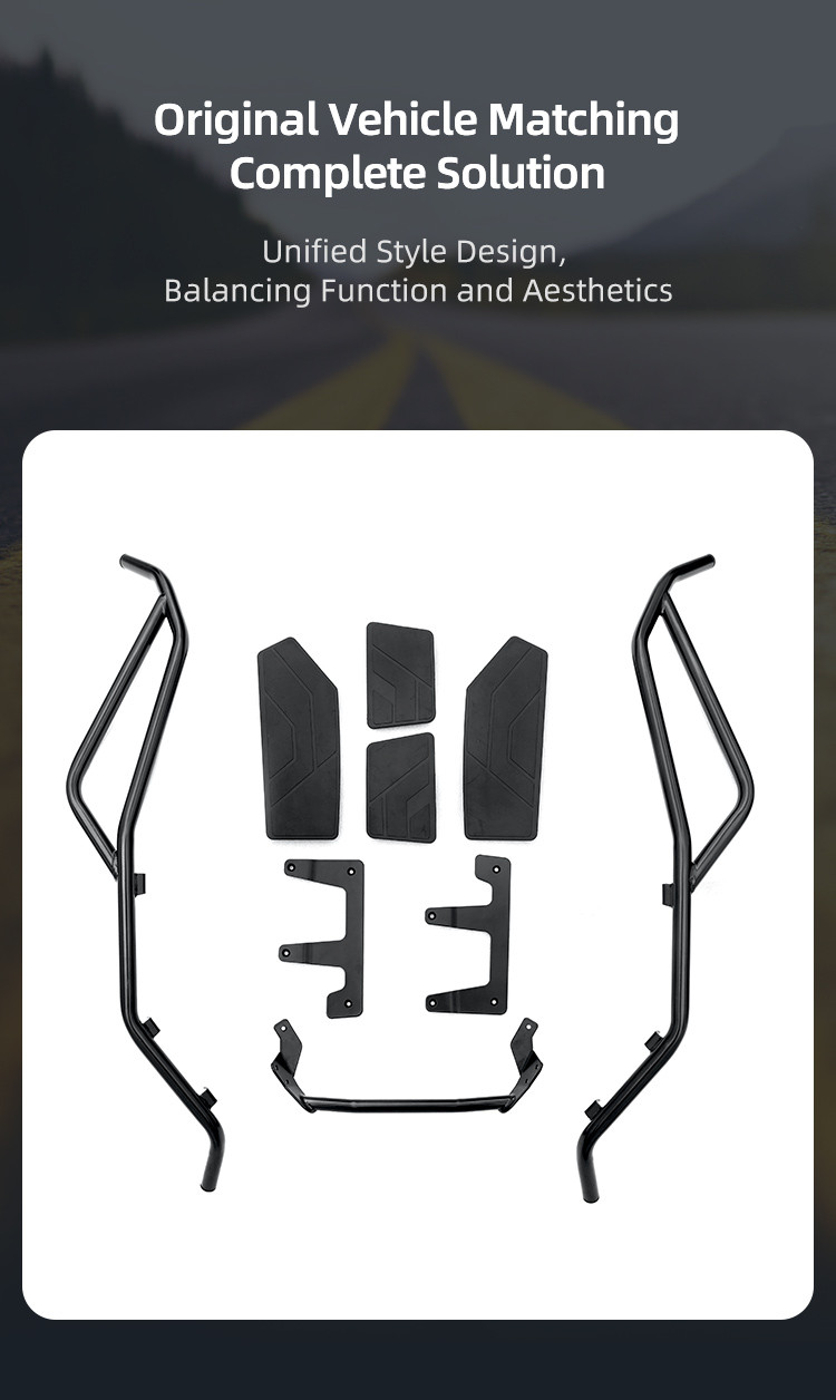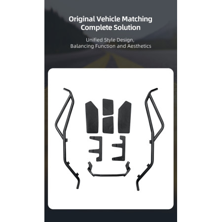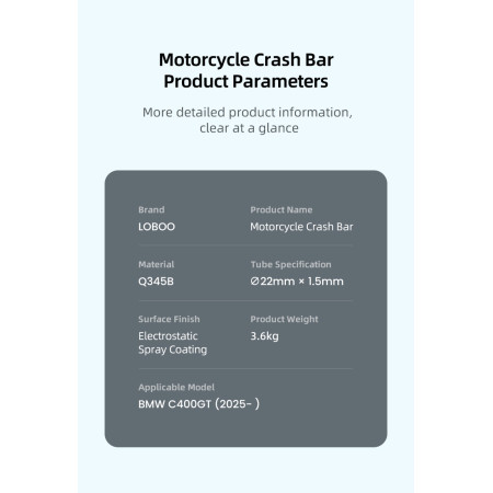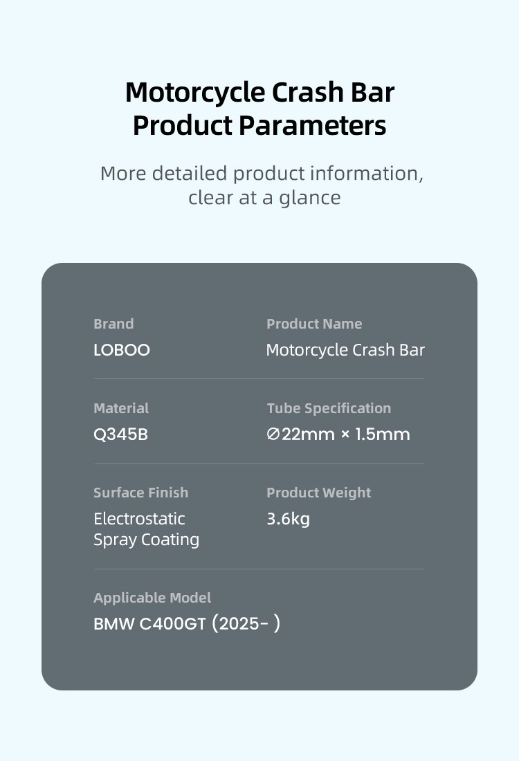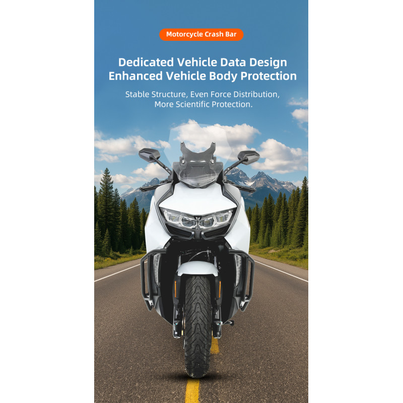 Projektowany na bazie danych oryginalnej konstrukcji BMW, crash bar idealnie dopasowuje się do ramy C400GT 2025+, tworząc mocny „pancerz” wokół silnika i boków skutera. Wykonany z trwałej stali Q345B o grubych ściankach (22 mm x 1,5 mm), solidnie spawany, żeby radzić sobie z upadkami, które mogą się zdarzyć każdemu motocykliście.