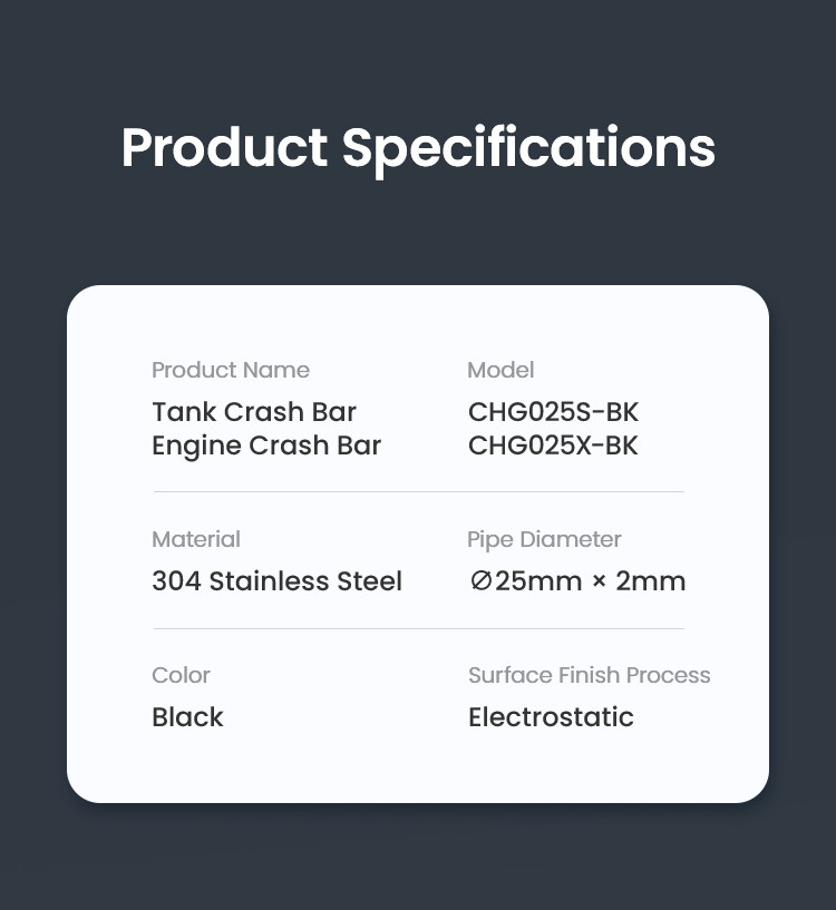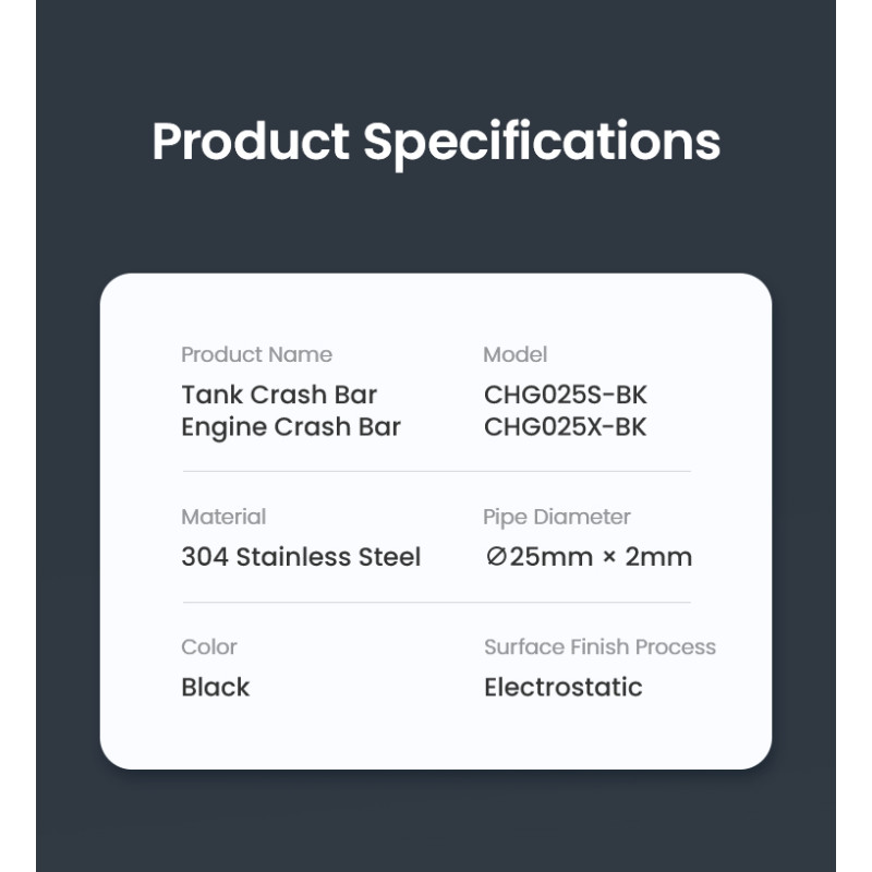 Możliwy do stworzenia zestaw składa się z dwóch spawanych elementów: górnej ochrony zbiornika (Tank Crash Bar CHG025S-BK) i dolnych gmolów silnika (Engine Crash Bar CHG025X-BK), które razem tworzą solidny pancerz wokół najbardziej narażonych partii motocykla. Dzięki temu ryzyko uszkodzeń owiewek, baku czy elementów silnika przy przewrotce jest znacząco zredukowane.