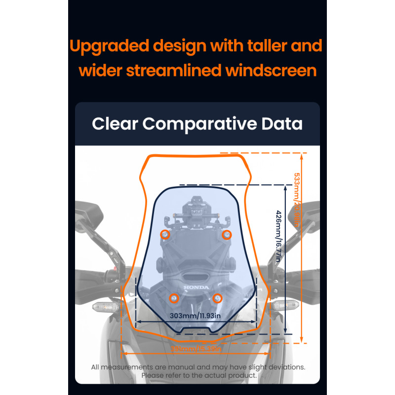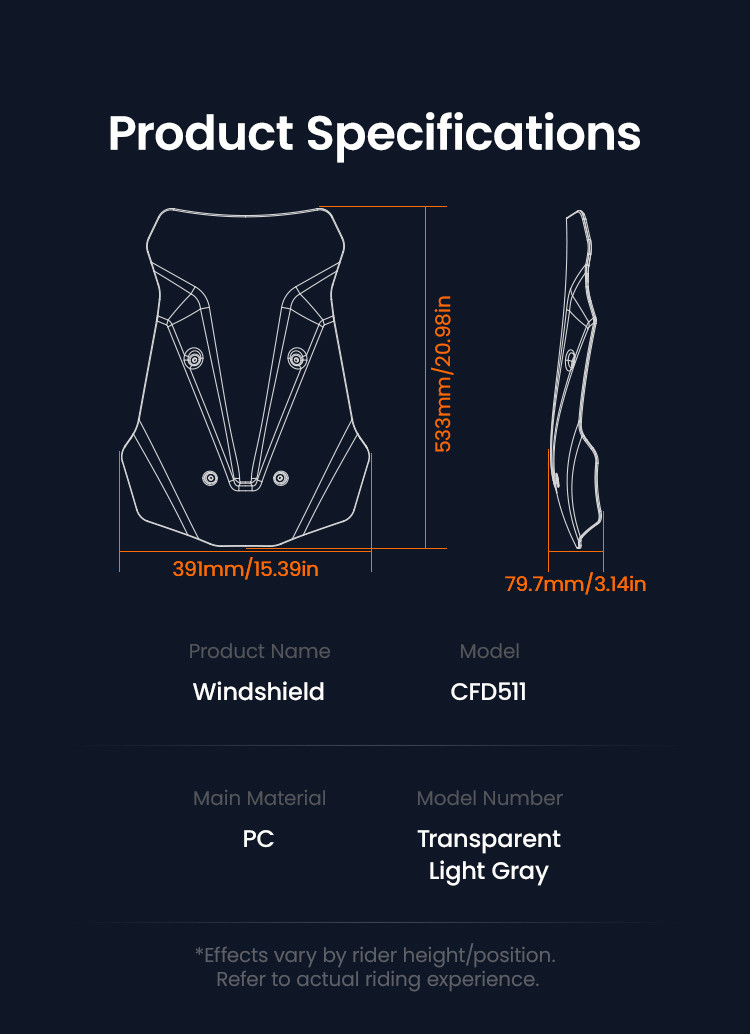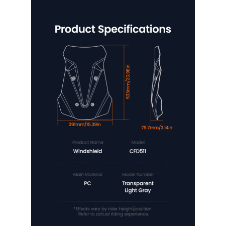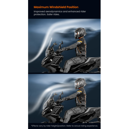 Ten model CFD511 jest wyższy (533 mm) i szerszy (397 mm) niż fabryczna szyba ADV350, co pozwala przepuszczać mniej turbulentnego powietrza w okolice kasku i klatki piersiowej – zmniejsza to zmęczenie podczas dłuższej jazdy autostradowej lub turystycznej.