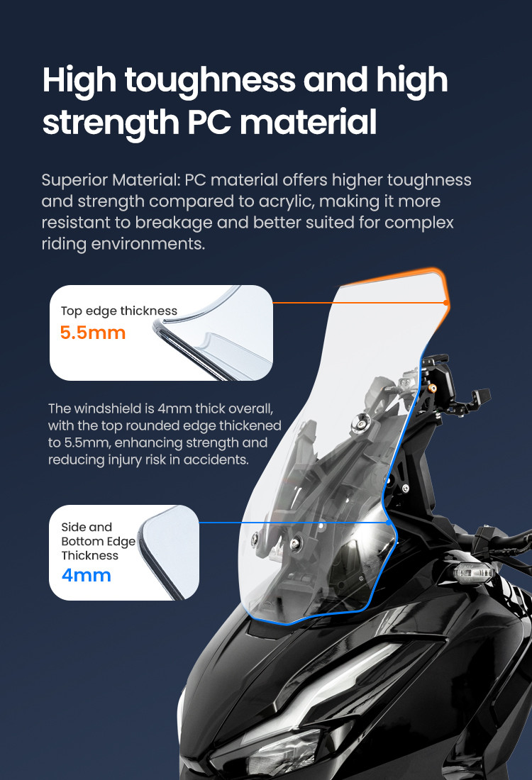 Dla motocyklistów, którzy jeżdżą daleko, często z pasażerem i w różnych warunkach pogodowych, standardowa osłona przednia to dopiero początek komfortu. LOBOO CFD511 to wysokiej klasy szyba turystyczna wykonana z super-wytrzymałego poliwęglanu (PC), która podnosi poziom ochrony, wygody i ergonomii jazdy na Twojej Honda ADV350 (model 2025 i nowsze).