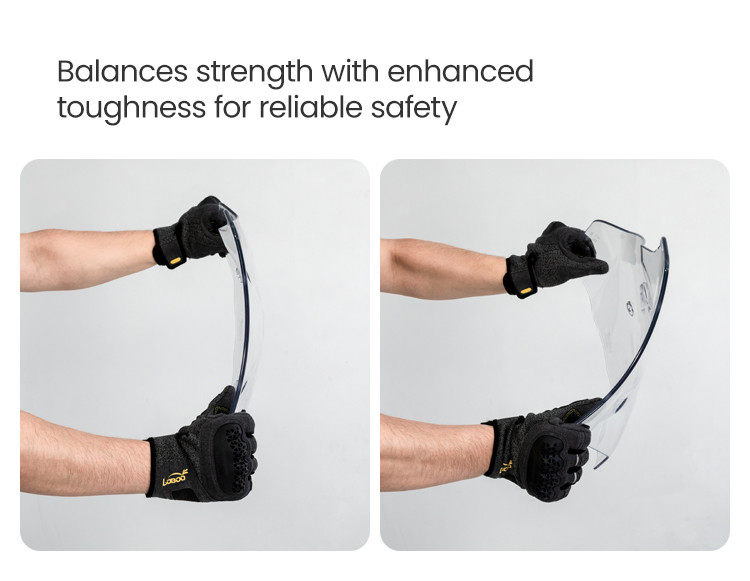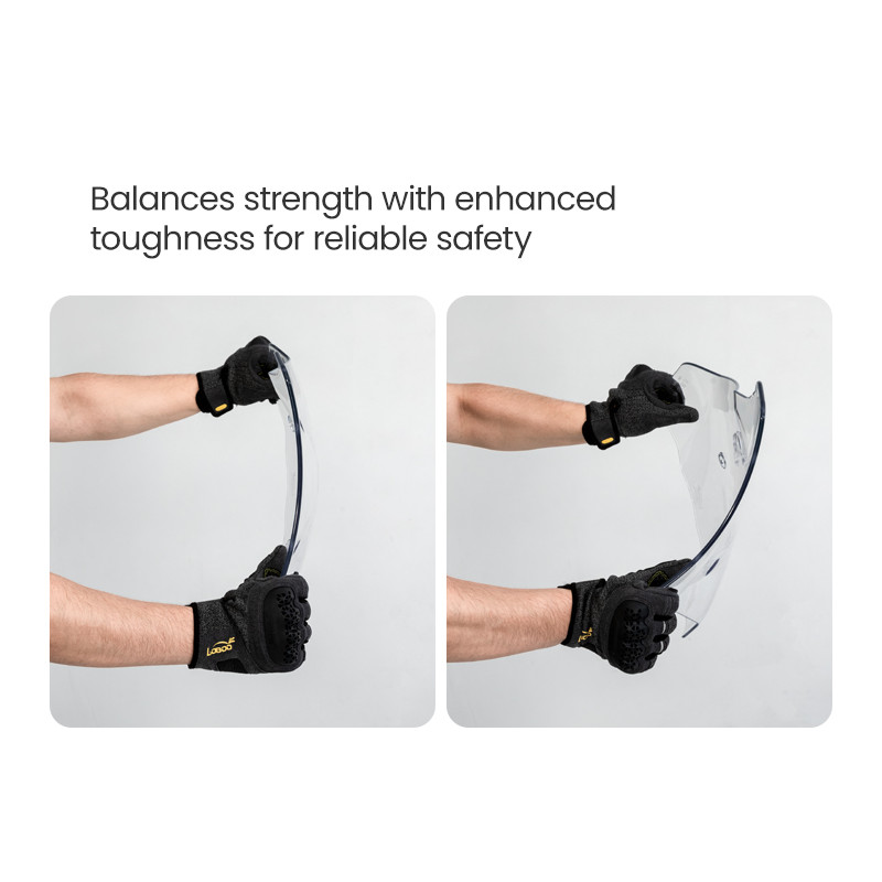 Zamiast zwykłego akrylu czy pleksi, LOBOO używa polikarbonatu o bardzo dużej wytrzymałości – tego samego materiału, z którego robi się m.in. tarcze ochronne. Dzięki temu szyba jest elastyczna i praktycznie "niepękalna", co oznacza, że przy uderzeniu kamieni czy drobnych odłamków nie pęka w niebezpieczne kawałki.
