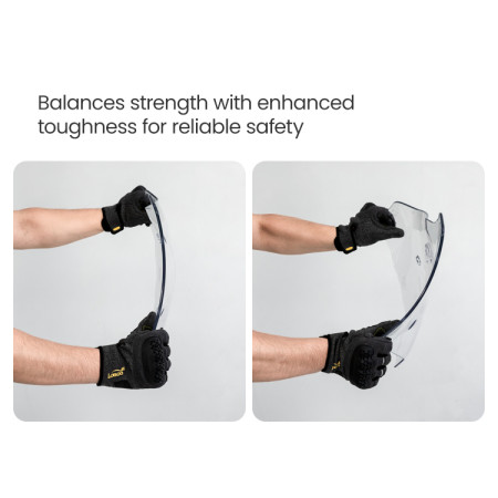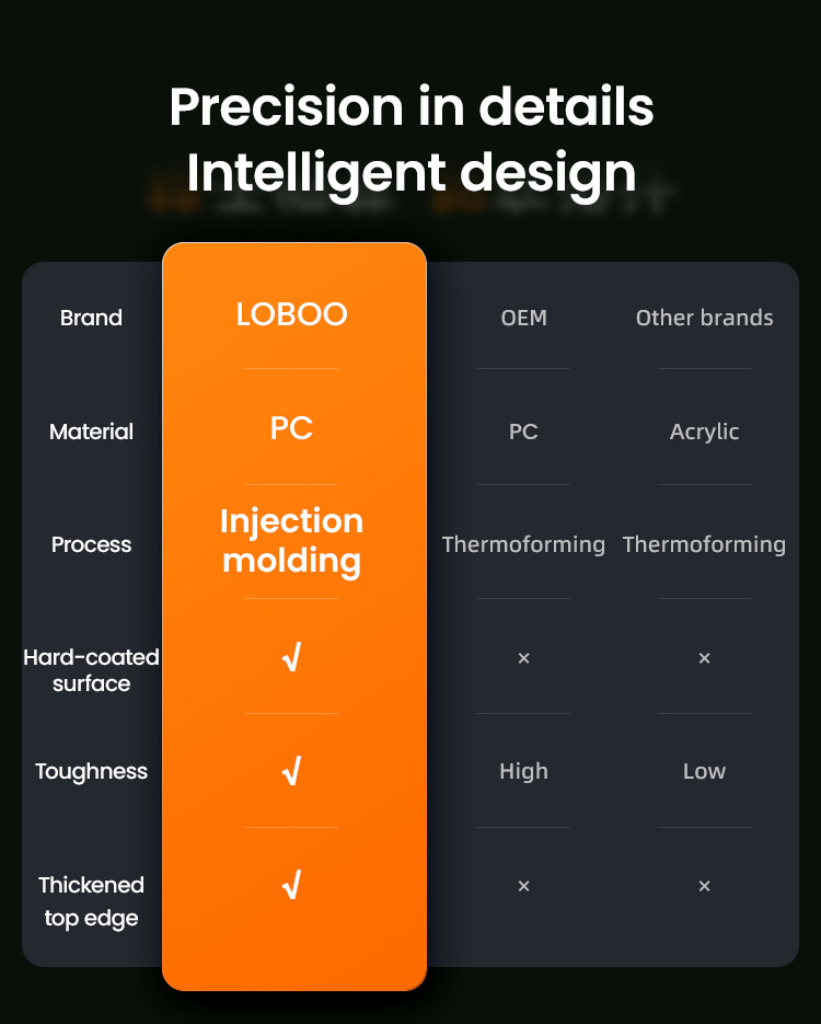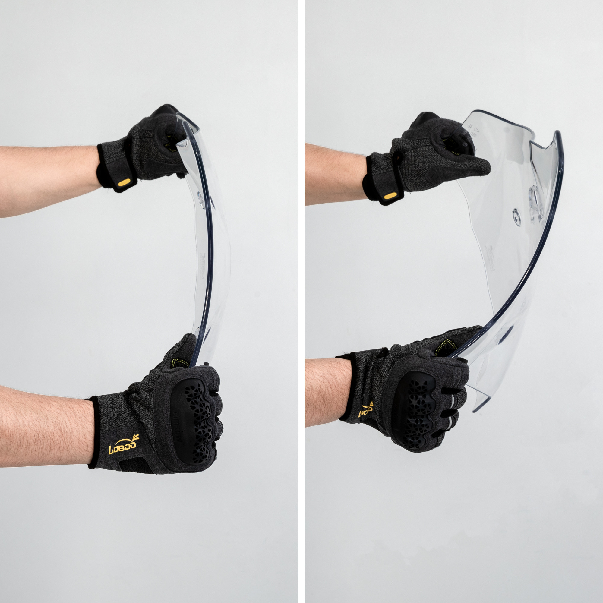 Zamiast zwykłego akrylu czy pleksi, LOBOO używa polikarbonatu o bardzo dużej wytrzymałości – tego samego materiału, z którego robi się m.in. tarcze ochronne. Dzięki temu szyba jest elastyczna i praktycznie "niepękalna", co oznacza, że przy uderzeniu kamieni czy drobnych odłamków nie pęka w niebezpieczne kawałki.