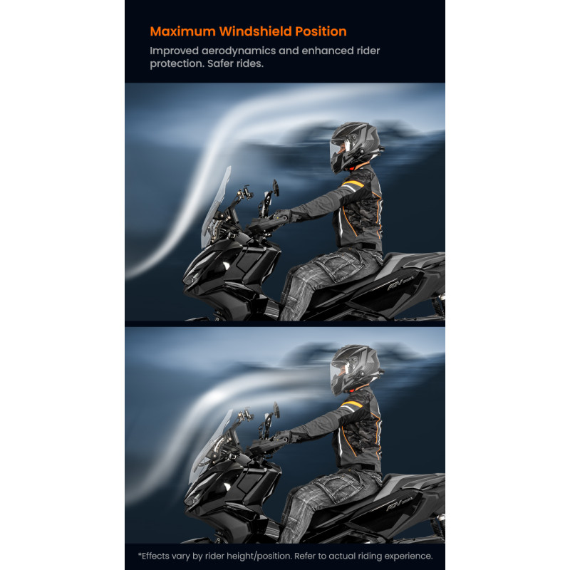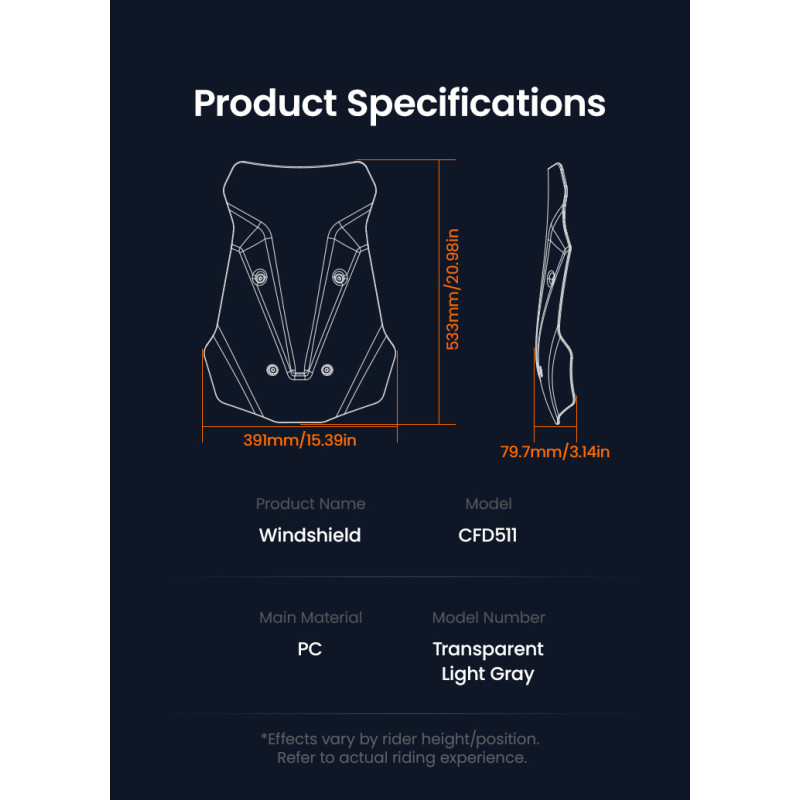 Ten model CFD511 jest wyższy (533 mm) i szerszy (397 mm) niż fabryczna szyba ADV350, co pozwala przepuszczać mniej turbulentnego powietrza w okolice kasku i klatki piersiowej – zmniejsza to zmęczenie podczas dłuższej jazdy autostradowej lub turystycznej.