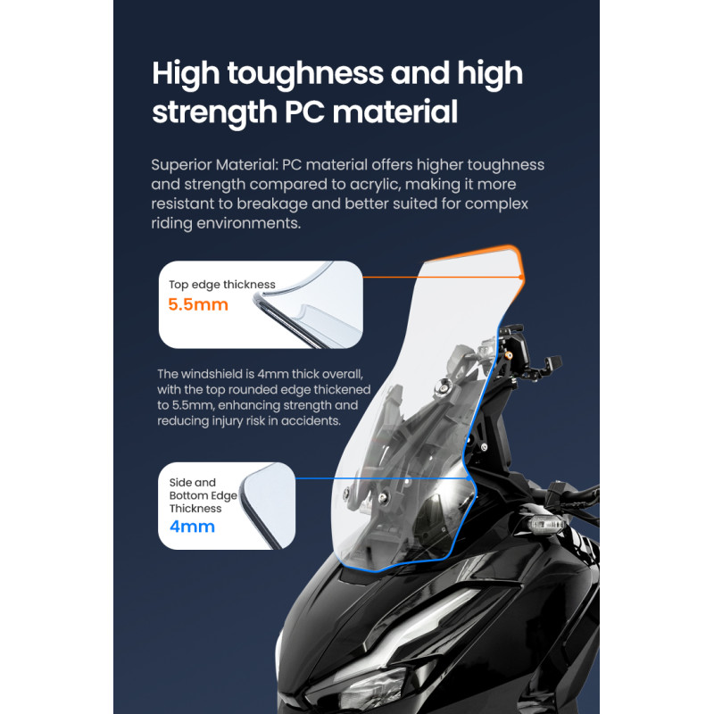 Dla motocyklistów, którzy jeżdżą daleko, często z pasażerem i w różnych warunkach pogodowych, standardowa osłona przednia to dopiero początek komfortu. LOBOO CFD511 to wysokiej klasy szyba turystyczna wykonana z super-wytrzymałego poliwęglanu (PC), która podnosi poziom ochrony, wygody i ergonomii jazdy na Twojej Honda ADV350 (model 2025 i nowsze).