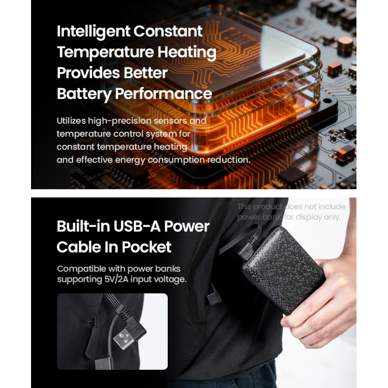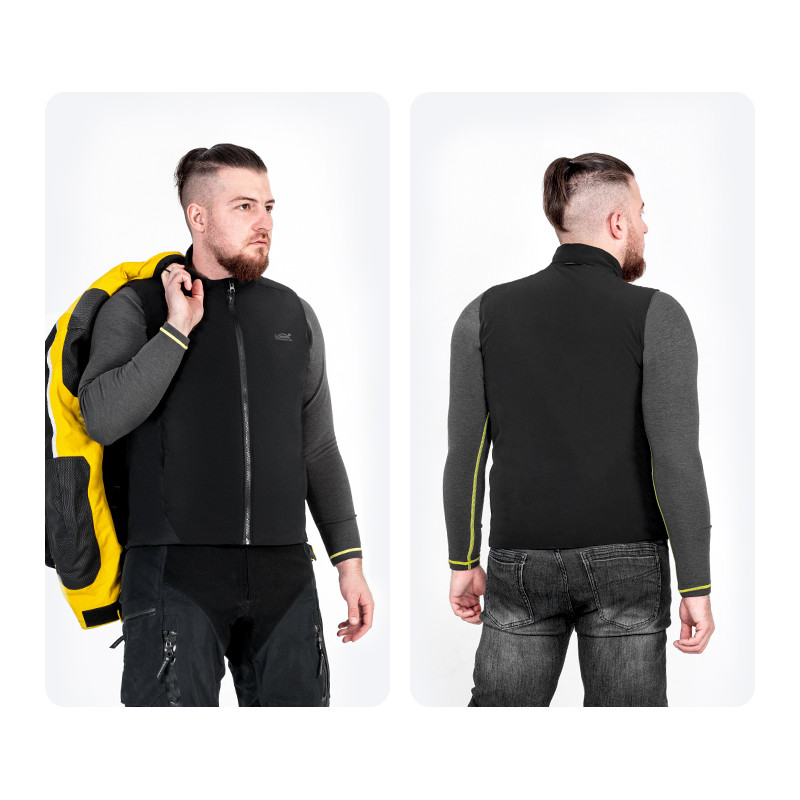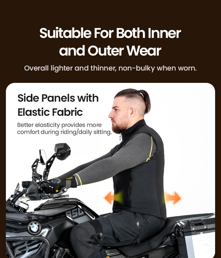 Wnętrze kamizelki pokryte jest termorefleksyjną powłoką, która odbija ciepło z powrotem do ciała, maksymalizując efekt ogrzewania. Zewnętrzna warstwa z nylonu i spandexu z membraną TPU jest wiatroodporna, a elastyczne panele zapewniają dopasowanie bez uczucia skrępowania – nawet pod kurtką motocyklową.