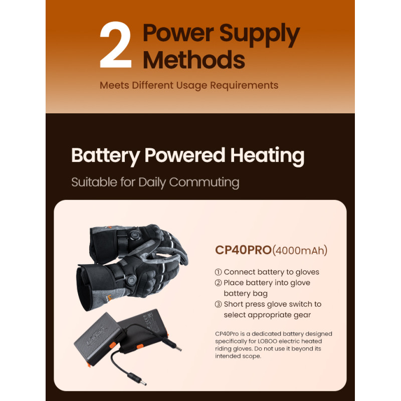 Rękawice można zasilać przez port USB — np. z powerbanku lub dedykowanej baterii (opcjonalnej) — co daje Ci swobodę wyboru. To szczególnie przydatne na dłuższe trasy, gdzie dostęp do zasilania z motocykla nie zawsze jest optymalny.
