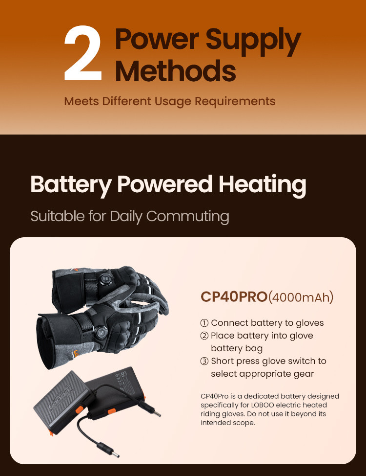 Rękawice można zasilać przez port USB — np. z powerbanku lub dedykowanej baterii (opcjonalnej) — co daje Ci swobodę wyboru. To szczególnie przydatne na dłuższe trasy, gdzie dostęp do zasilania z motocykla nie zawsze jest optymalny.