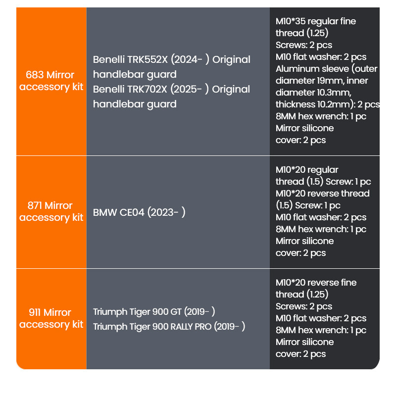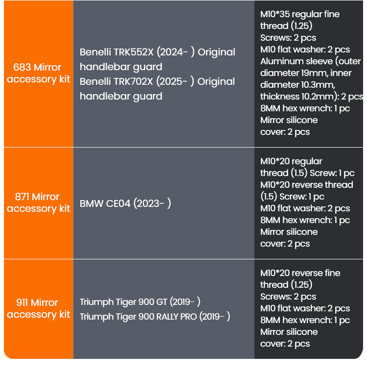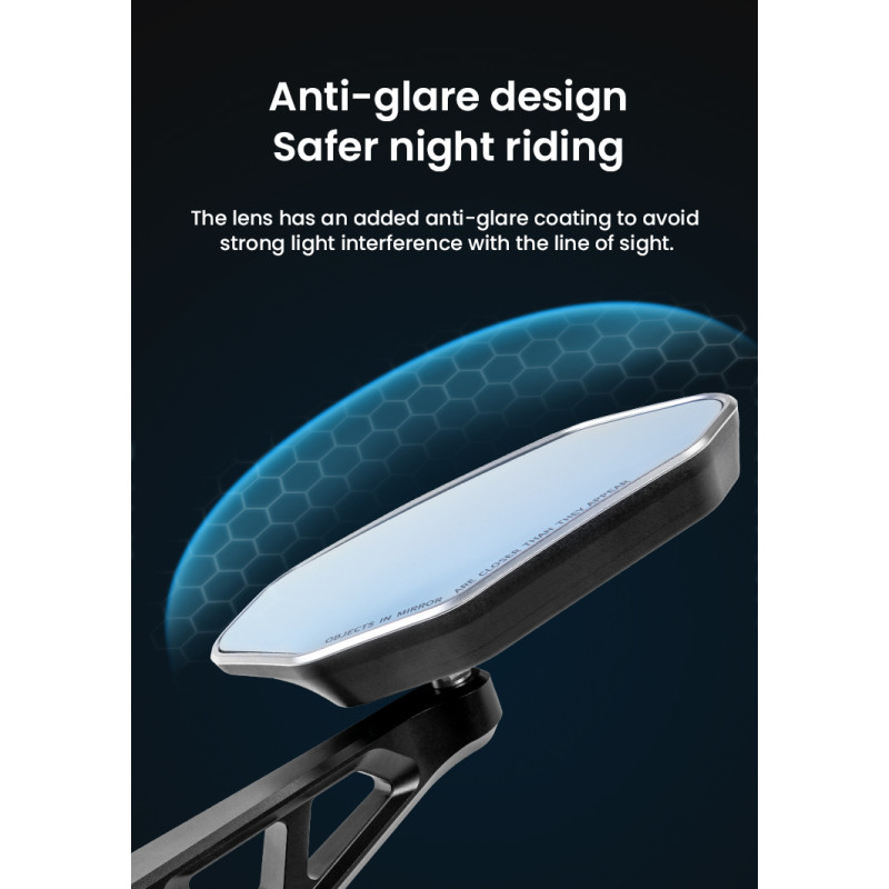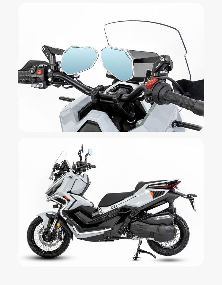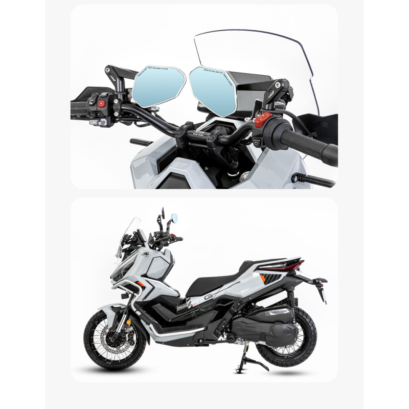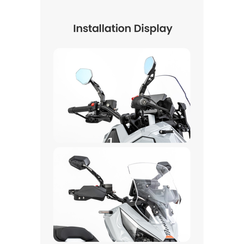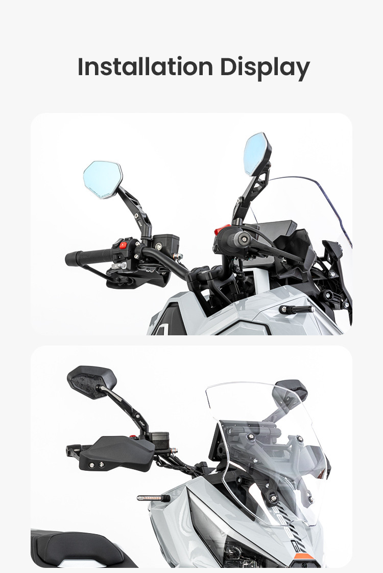 Lusterka RM03 wyróżniają się geometrycznym, dynamicznym kształtem — to coś więcej niż zwykłe odbicia zza kierownicy. Ich agresywna sylwetka idealnie pasuje do nowoczesnych motocykli ADV i naked, podkreślając ich charakter i styl.