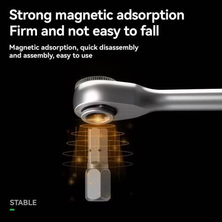 Grzechotka posiada silny magnes, który stabilnie trzyma bity podczas pracy. Ułatwia to szybkie zakładanie i zdejmowanie końcówek, a także zapobiega ich przypadkowemu wypadaniu.