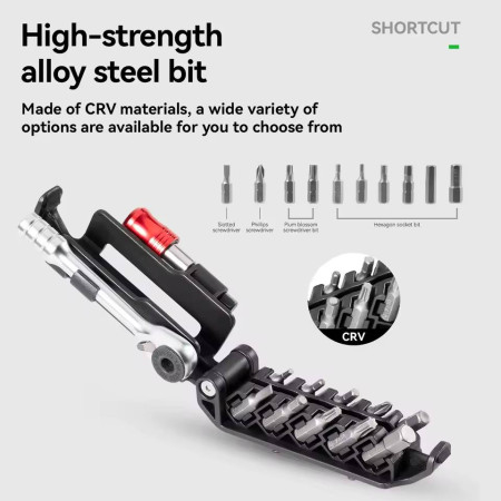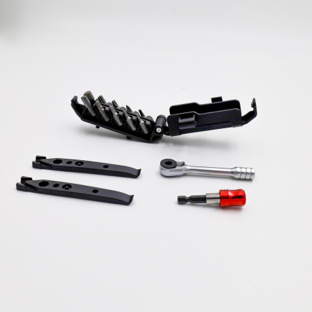 W komplecie znajduje się bogaty zestaw bitów, który umożliwia wykonanie większości napraw rowerowych: regulację hamulców, kierownicy, sztycy, przerzutek i wielu innych elementów.