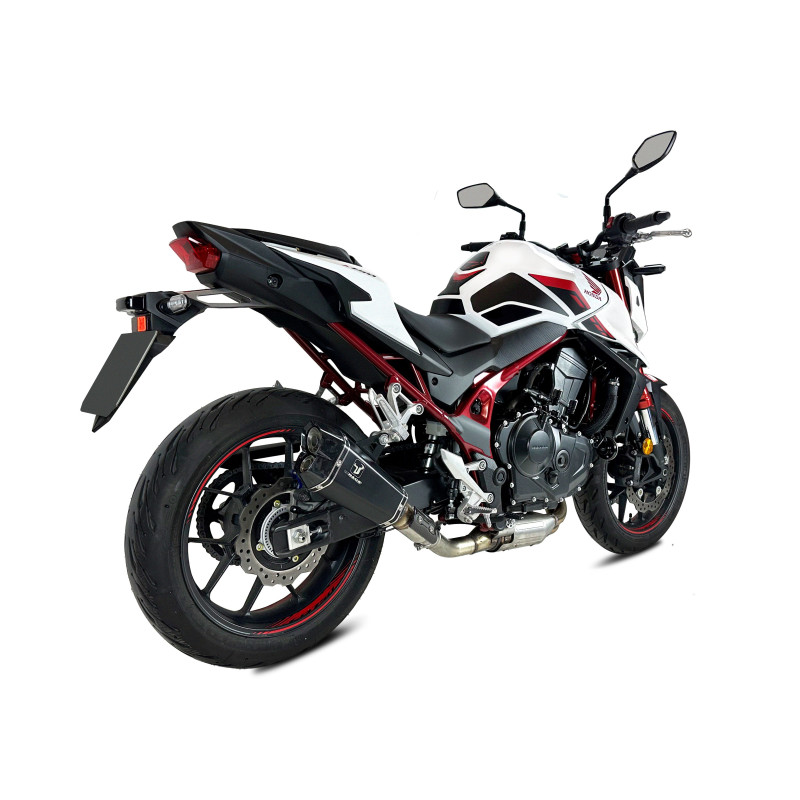 Konstrukcja tłumika została wykonana ze stali nierdzewnej SUS 304, a korpus pokryto lakierem ceramicznym w kolorze matt black odpornym na wysoką temperaturę. Producent wskazuje również zastosowanie końcówki wydechu z forged carbon oraz osłony termicznej z carbonu. Takie zestawienie materiałów zapewnia nowoczesny, techniczny wygląd i dobrze pasuje do sportowo-ulicznego charakteru modelu CB 750 Hornet.
