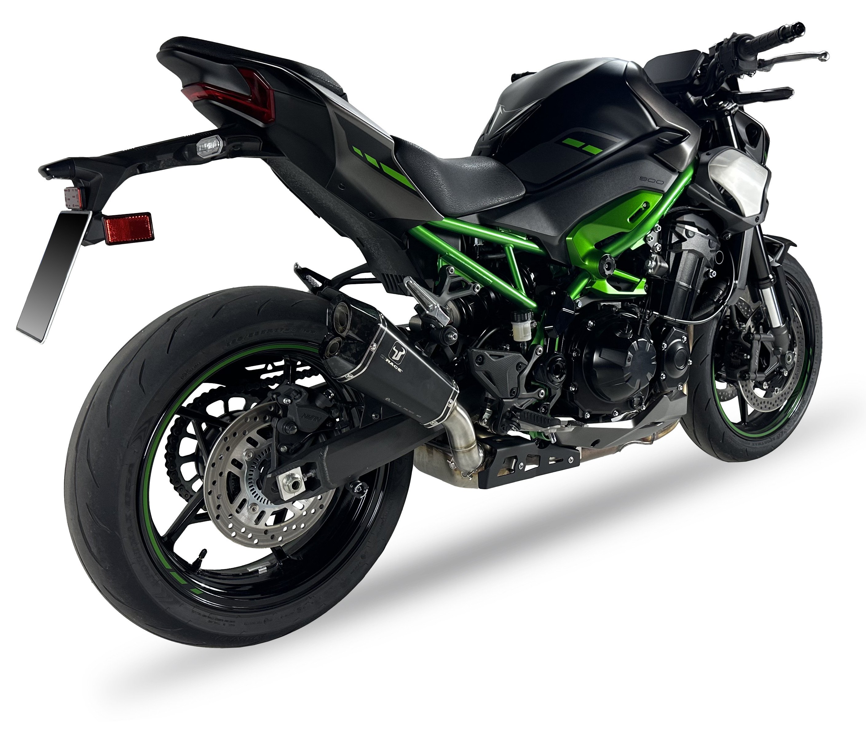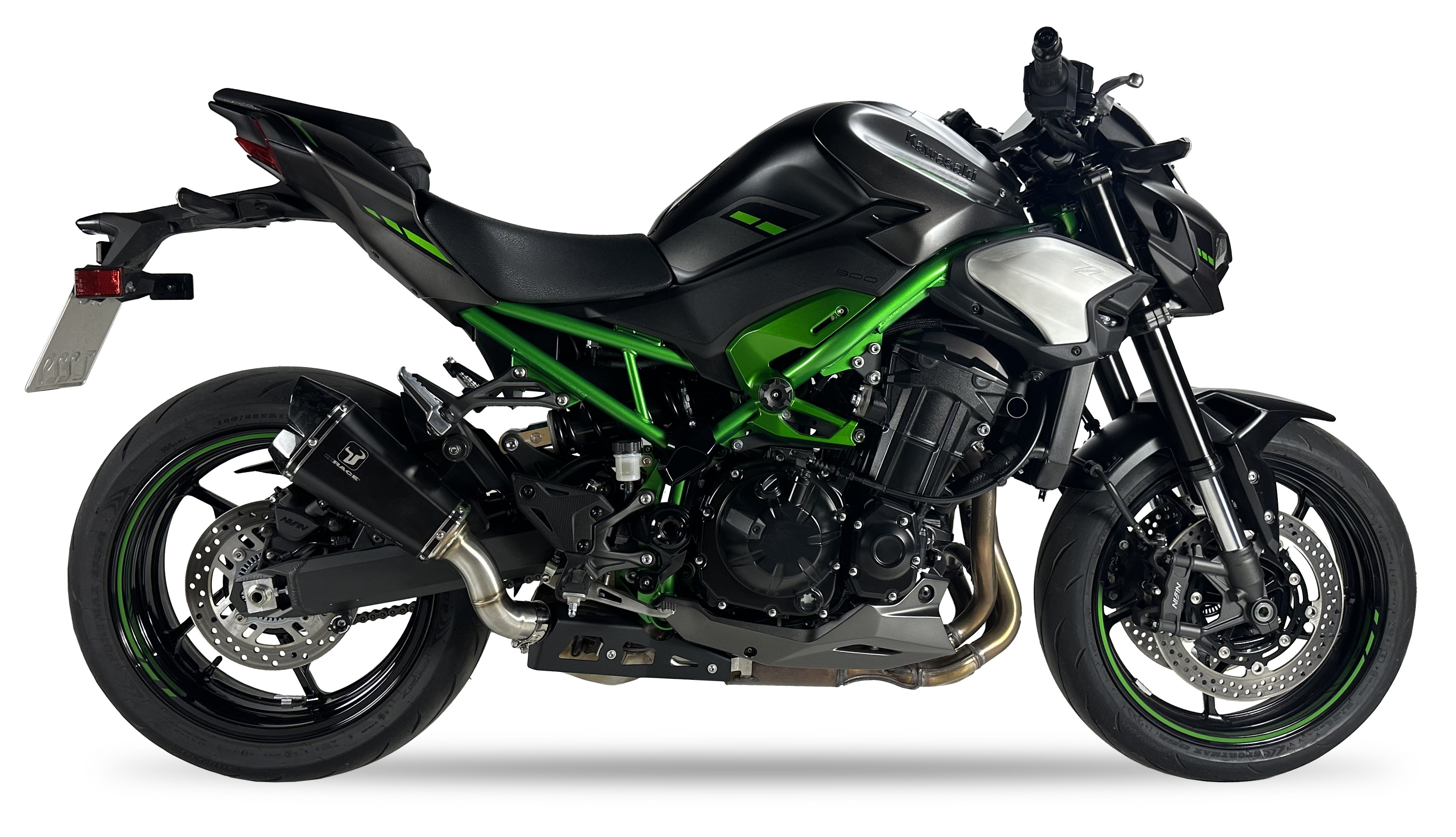 Konstrukcja tłumika została wykonana ze stali nierdzewnej SUS 304, a korpus pokryto lakierem ceramicznym w kolorze satin matt black, odpornym na wysoką temperaturę. Producent wskazuje również zastosowanie końcówki wydechu z forged carbon, osłony termicznej z carbonu oraz nierdzewnych nitów i pierścieni wykończeniowych. Takie zestawienie materiałów nadaje tłumikowi nowoczesny, techniczny wygląd i dobrze pasuje do sportowo-ulicznego charakteru modelu Z 900.
