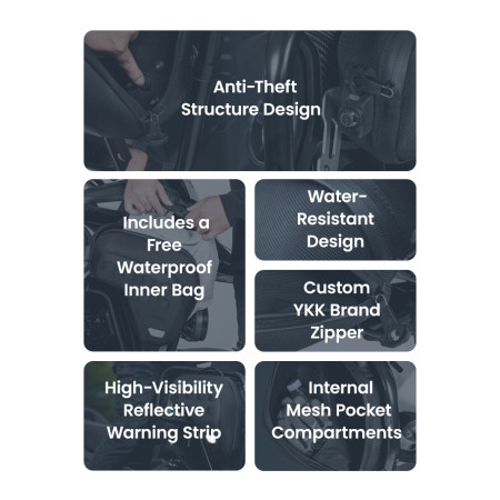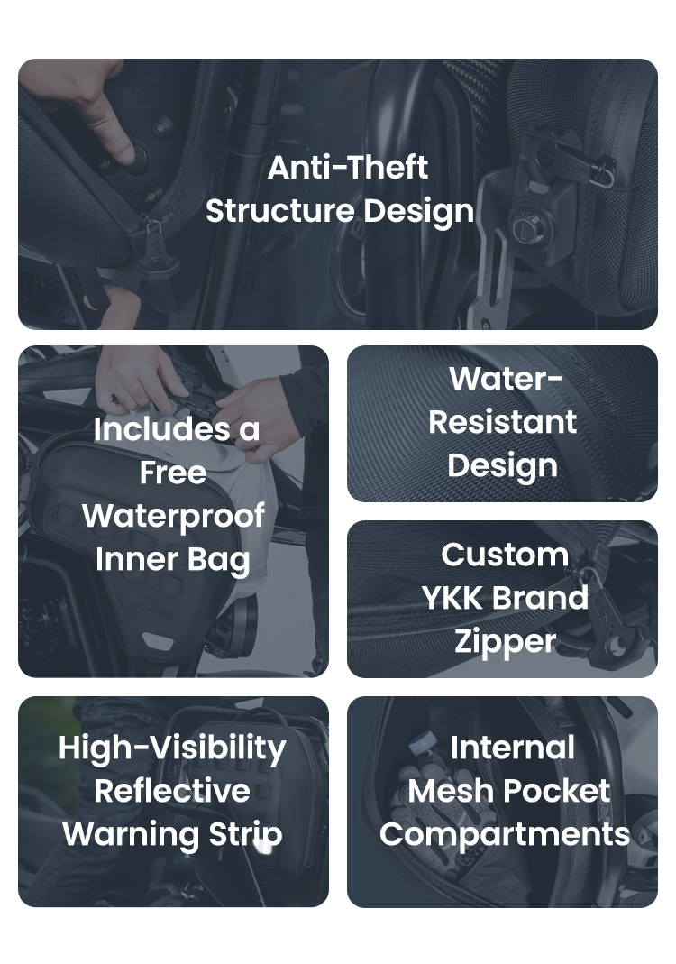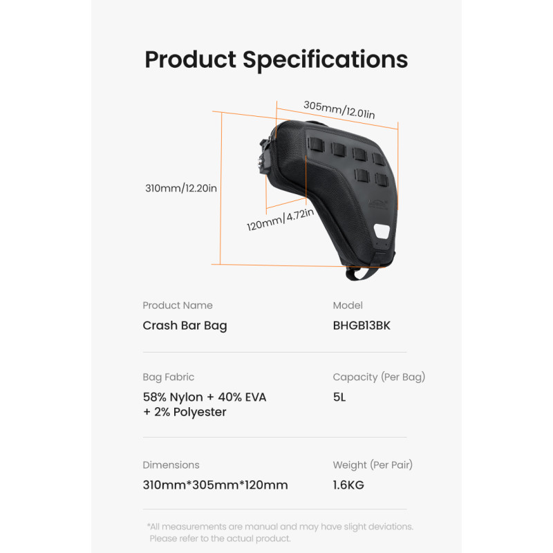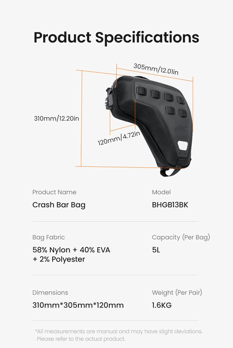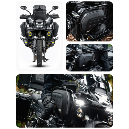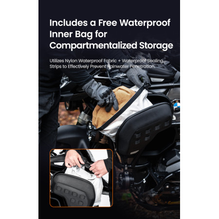 Pod względem rozmiaru to bagaż, który daje odczuwalnie więcej miejsca, ale nie przytłacza motocykla. Wymiary jednej torby to 310 × 305 × 120 mm, a w zestawie znajdują się 2 torby i 2 wodoodporne worki wewnętrzne. To idealna opcja dla riderów, którzy chcą lepiej wykorzystać motocykl w podróży i mieć szybki dostęp do najważniejszych rzeczy bez ciągłego otwierania kufrów.