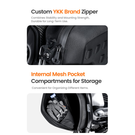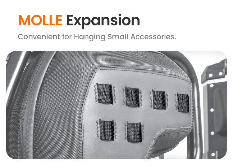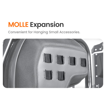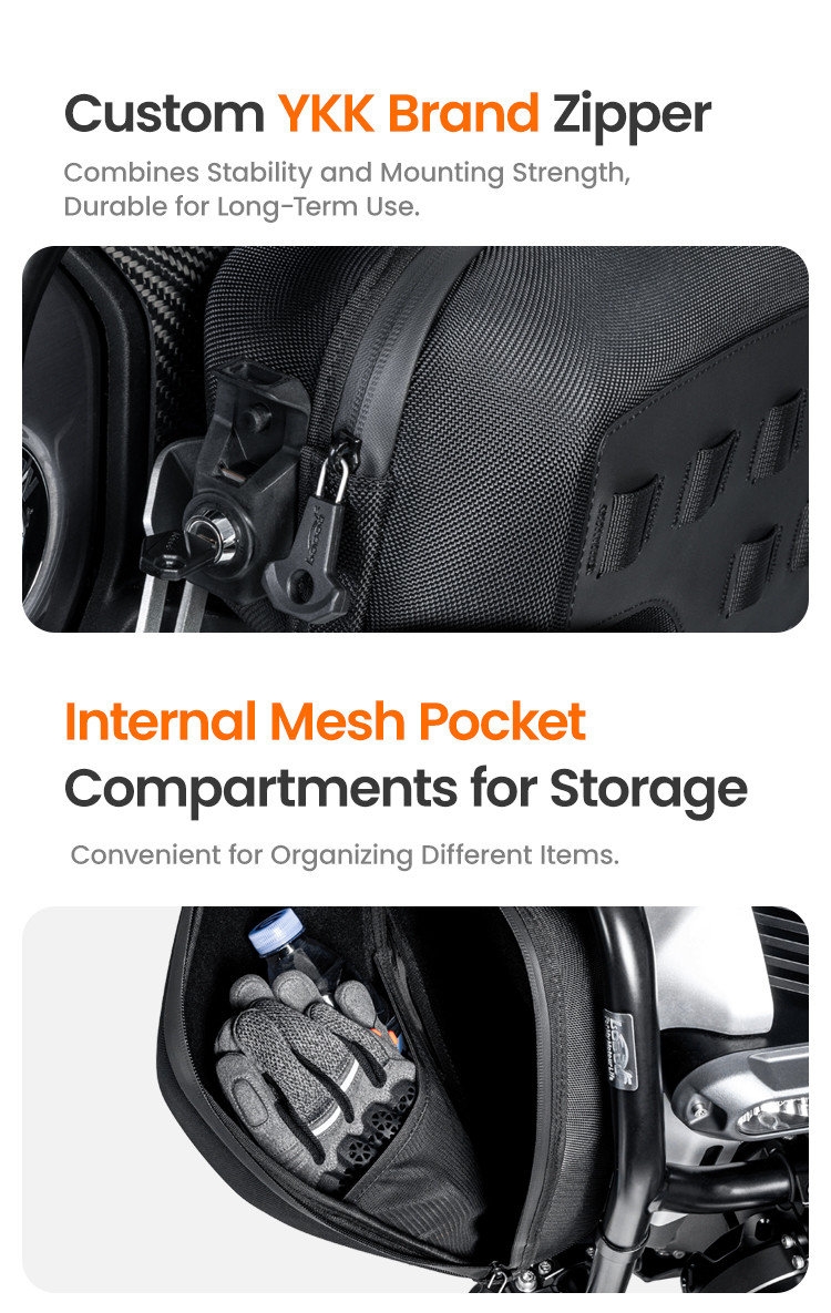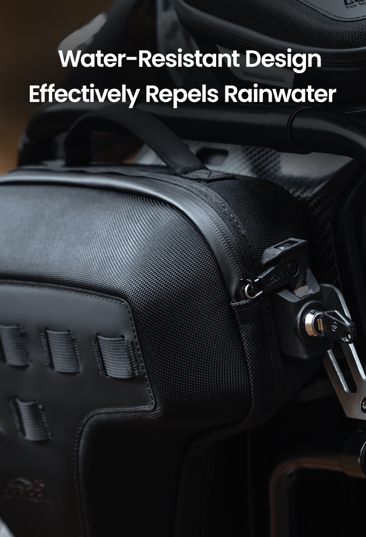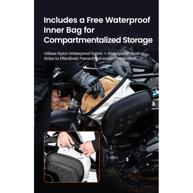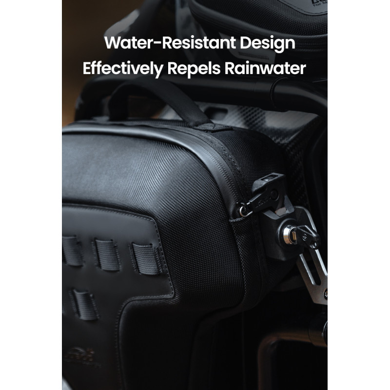 Pod względem pakowności jest tu naprawdę sensownie. Każda torba oferuje 5 litrów pojemności, a w środku znajdują się wewnętrzne kieszenie z siatki, które pomagają utrzymać porządek wśród drobnych przedmiotów, narzędzi, przekąsek czy wyposażenia awaryjnego. Dodatkowo na zewnątrz zastosowano punkty montażowe MOLLE, dzięki którym można dopiąć kolejne małe akcesoria, karabińczyki albo dodatkowe kieszenie. To rozwiązanie, które szczególnie docenią motocykliści lubiący mieć swój zestaw dopracowany w każdym detalu.