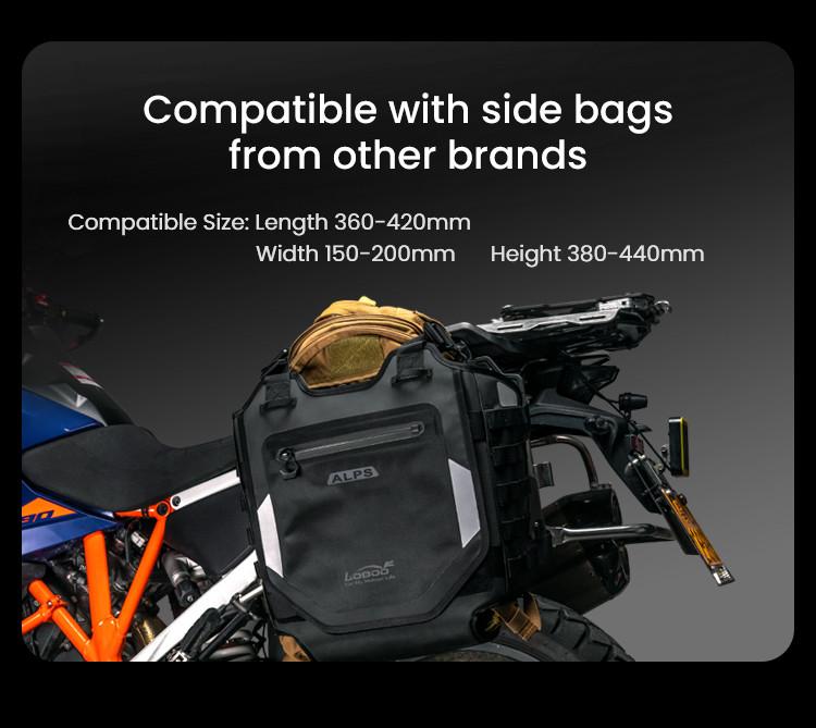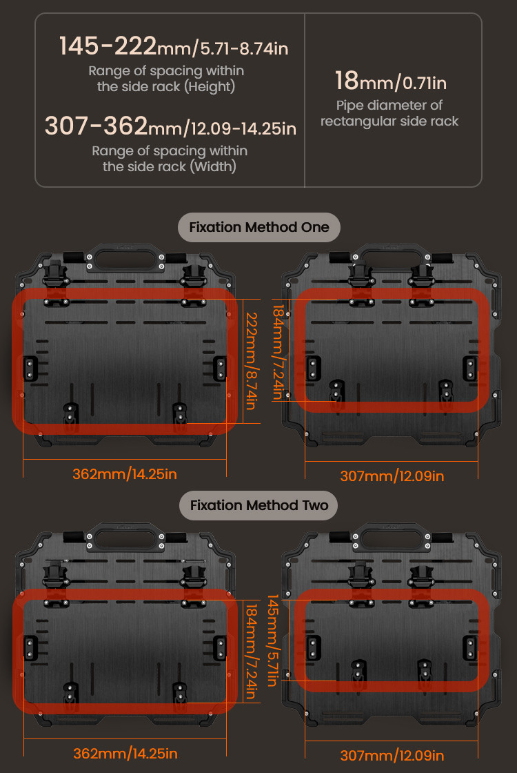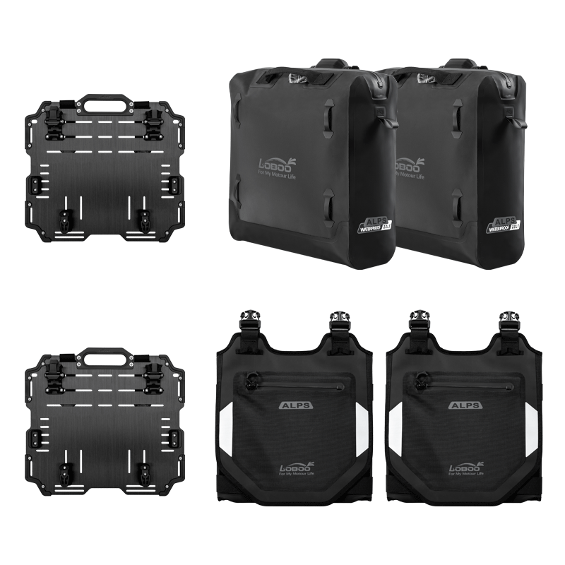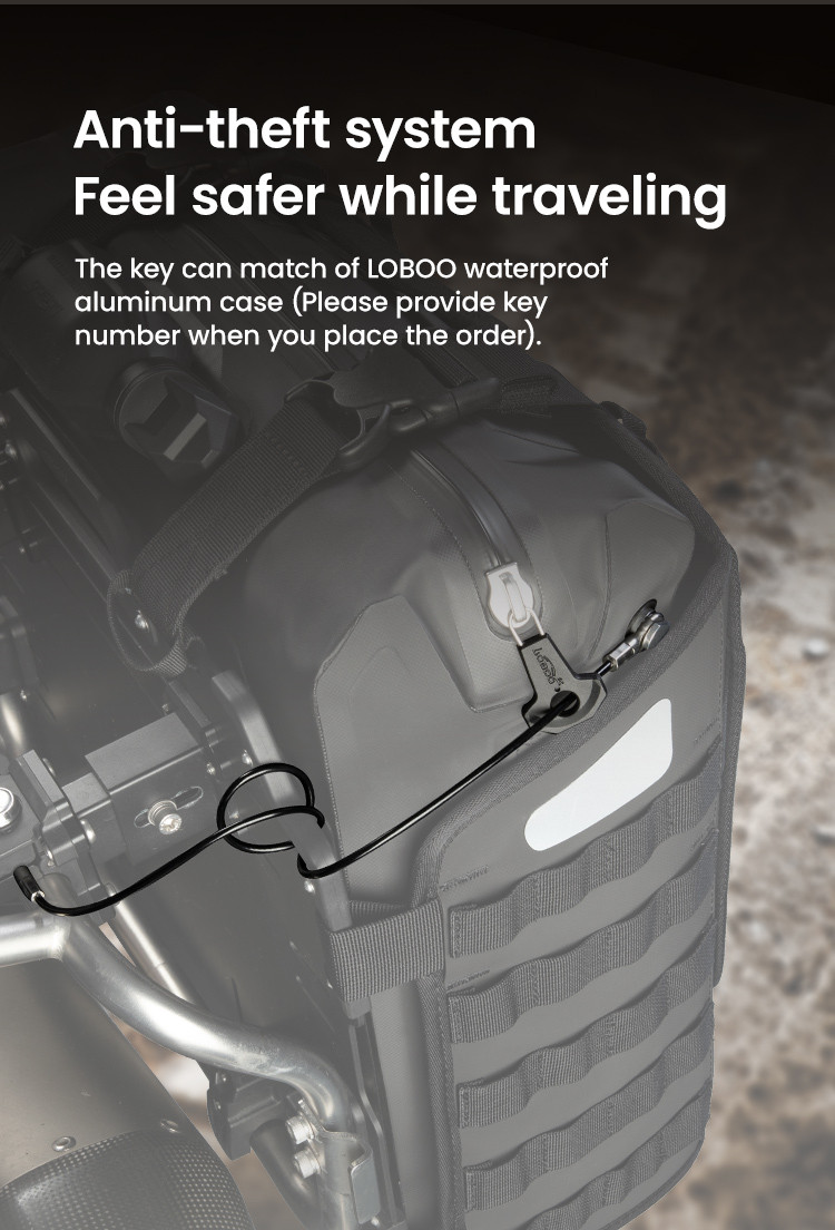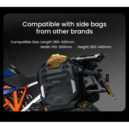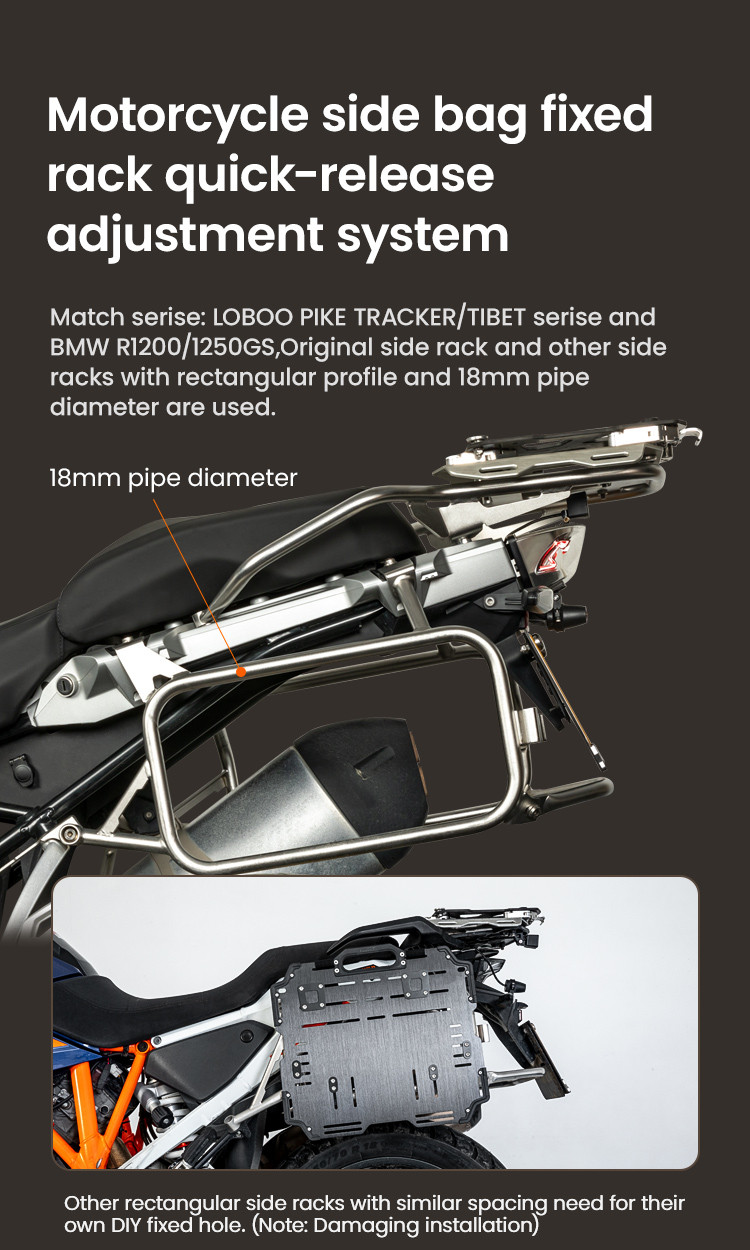 Regulowana struktura szybkiego montażu: Zaprojektowany z myślą o kompatybilności z bagażnikami serii LOBOO TIBET i PIKE TRACKER, a także oryginalnymi bagażnikami bocznymi BMW.