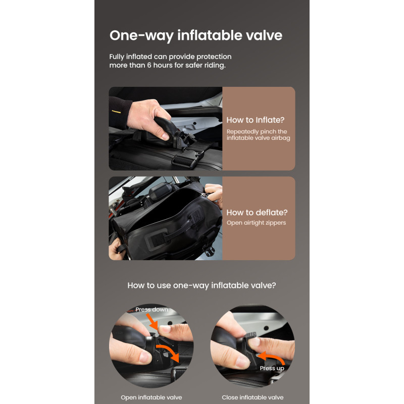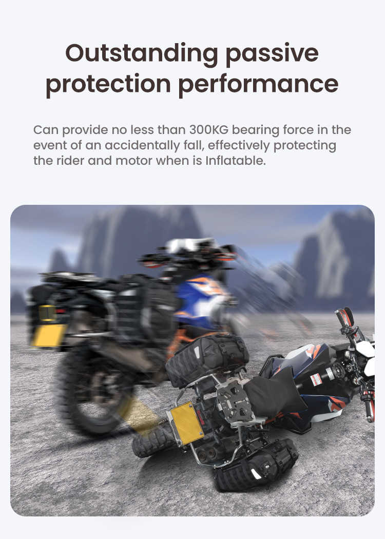 System ochrony przed napompowaniem: Zapewnia wyjątkową ochronę pasywną, o nośności ponad 300 kg podczas upadków lub wypadków, skutecznie chroniąc kierowcę, pasażera i pojazd, zwiększając bezpieczeństwo jazdy.